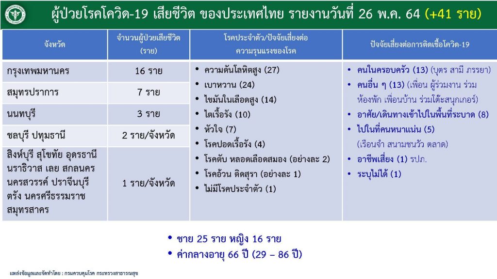 สำหรับยอดผู้เสียชีวิตวันนี้ พบว่ากรุงเทพมหานคร มีจำนวนผู้เสียชีวิตมากที่สุด 16 คน รองลงมาคือ สมุทรปราการ 7 คน นนทบุรี 3 คน ขณะที่ ชลบุรี ปทุมธานี จังหวัดละ 2 คน สิงห์บุรี สุโขทัย อุดรธานี นราธวาส เลย สกลนคร นครสวรรค์ ปราจีนบุรี ตรัง นครศรีธรรมราช สมุทรสาคร จังหวัดละ 1 คน โรคประจำตัวและปัจจัยเสี่ยงต่อความรุนแรงของโรค อันดับ 1 คือ ความดันโลหิตสูง รองลงมาคือ เบาหวาน ไขมันในเลือดสูง ไตเรื้อรัง หัวใจ โรคปอดเรื้อรัง โรคตับ หลอดเลือดสมอง โรคอ้วน ติดสุรา ขณะที่ปัจจัยเสี่ยงต่อการติดเชื้อโควิด-19 อันดับ 1 คือ การติดเชื้อจากคนในครอบครัว รองลงมาคือ การพบปะเพื่อนฝูง รวมไปถึงการร่วมโต๊ะสนุกเกอร์ โดยแบ่งเป็นชาย 25 คน หญิง 16 คน อายุเฉลี่ย 29 ปี – 86 ปี ค่ากลางเสียชีวติยังเป็นกลุ่มผู้สูงอายุ ค่ากลางคือ อายุ 66 ปี นอกจากนี้มีการรายงาน ระยะเวลาวันที่รู้ว่าติดเชื้อจนถึงเสียชีวิต ยาวนานถึง 69 วัน แต่ค่ากลางอยู่ที่ 14 วัน