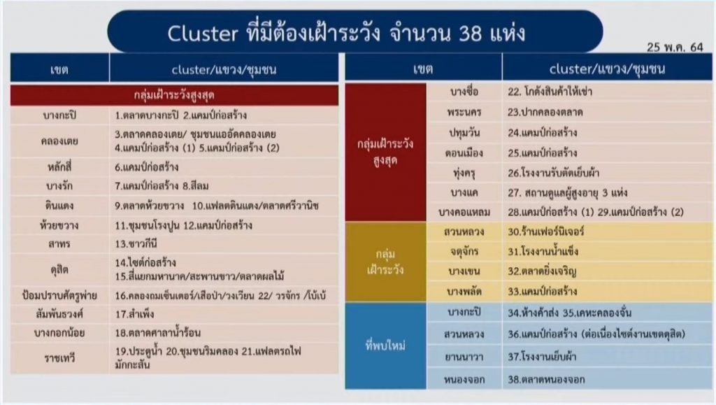 นอกจากนี้ยัง พบ 5 คลัสเตอร์ใหม่ที่มีการระบาดเพิ่มขึ้นในพื้นที่กรุงเทพฯ คือห้างสรรพสินค้าแห่งหนึ่งย่านลาดพร้าว โรงงานเย็ยผ้าเขตยานนาวา ตลาดแห่งหนึ่งเขตหนองจอก เคหะแห่งหนึ่งเขตคลองจั่น แคมป์ก่อสร้างแห่งหนึ่งเขตสวนหลวง