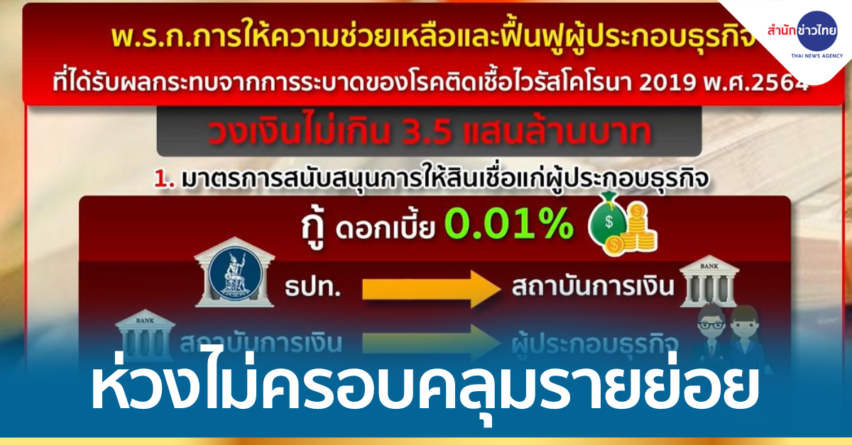 ขณะที่ ส.ส. ยังมีความเป็นห่วงในทางปฏิบัติ กังวลว่าธนาคารพาณิชย์จะไม่ปล่อยสินเชื่อให้กับธุรกิจขนาดเล็ก เช่น ร้านอาหาร ร้านค้าในตลาด โรงงานหรือโรงแรมขนาดเล็ก จึงแนะนำให้รัฐบาลแก้ปัญหานี้ พร้อมทั้งตั้งข้อสงสัยการช่วยเหลือของรัฐบาลด้วยการปล่อยสินเชื่อเงินกู้ยังไม่เพียงพอ และการออกพระราชกำหนดฉบับนี้ยังไม่เข้าถึงภาคธุรกิจอย่างจริงจัง เพราะสิ่งที่ต้องการคือ การช่วยพยุงด้วยกระแสเงินสด โดยได้เปรียบเทียบกับต่างประเทศ เช่น ญี่ปุ่น นิวซีแลนด์ และสหรัฐ กลับไปที่มีเงินเยียวยาช่วยทันที แต่ของรัฐบาลไทยกลับไม่ดำเนินการตรงนี้อย่างจริงจัง.-สำนักข่าวไทย