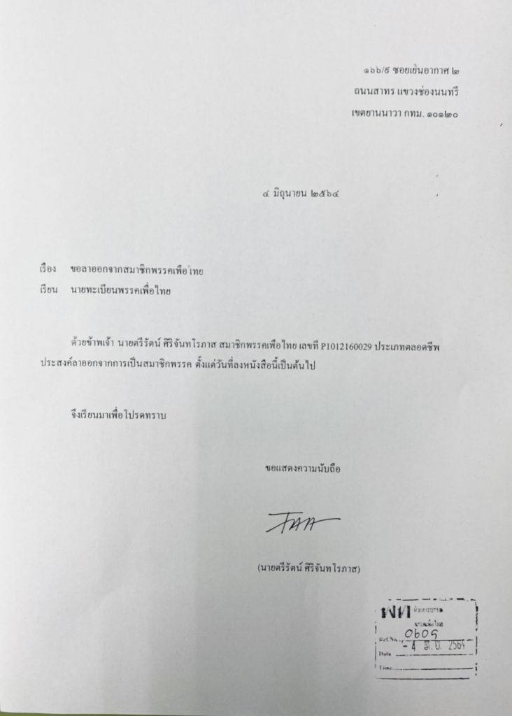 ผู้สื่อข่าวรายงานจากพรรคเพือไทยว่า นายตรีรัตน์ ศิริจันทโรภาส อดีตผู้สมัคร ส.ส.กทม.เขตบางกะปิ-วังทองหลาง และอดีตเลขาธิการกลุ่มเพื่อไทยพลัส พร้อมด้วย นายบำรุง รัตนะ อดีตสมาชิกสภากรุงเทพฯ (ส.ก.) เขตวังทองหลาง 4 สมัย และนายประเสริฐ ทองนุ่น อดีตสมาชิกสภากรุงเทพฯ (ส.ก.)เขตบางกะปิ ได้ยื่นใบลาออกจากการเป็นสมาชิกพรรคเพื่อไทย ประเภทตลอดชีพ ต่อนายทะเบียนพรรคการเมือง เมื่อเย็นเมื่อวานนี้ (4 มิ.ย.64)