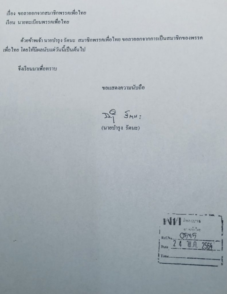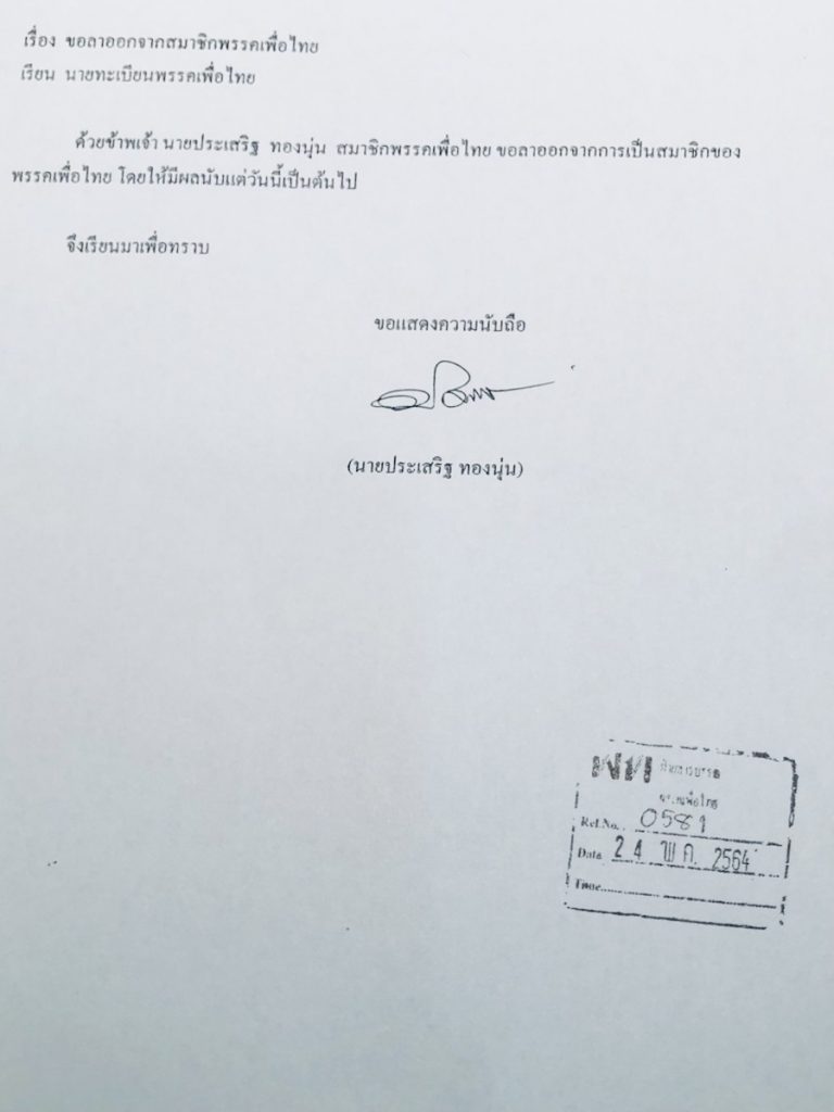 ดังนั้นตนและทีมงาน ประกอบไปด้วย อดีต ส.ก. อดีต ส.ข. และผู้ปฏิบัติงานการเมืองส่วนหนึ่งจากพรรคเพื่อไทยในเขตบางกะปิ และวังทองหลาง จึงตัดสินใจลาออกจากพรรคเพื่อไทย นับตั้งแต่วันนี้เป็นต้นไป เนื่องจากเป็นทางออกเดียวที่จะได้อาสาทำงานเคียงข้างและรับใช้ประชาชนในเขตบางกะปิและเขตวังทองหลางต่อไป.-สำนักข่าวไทย