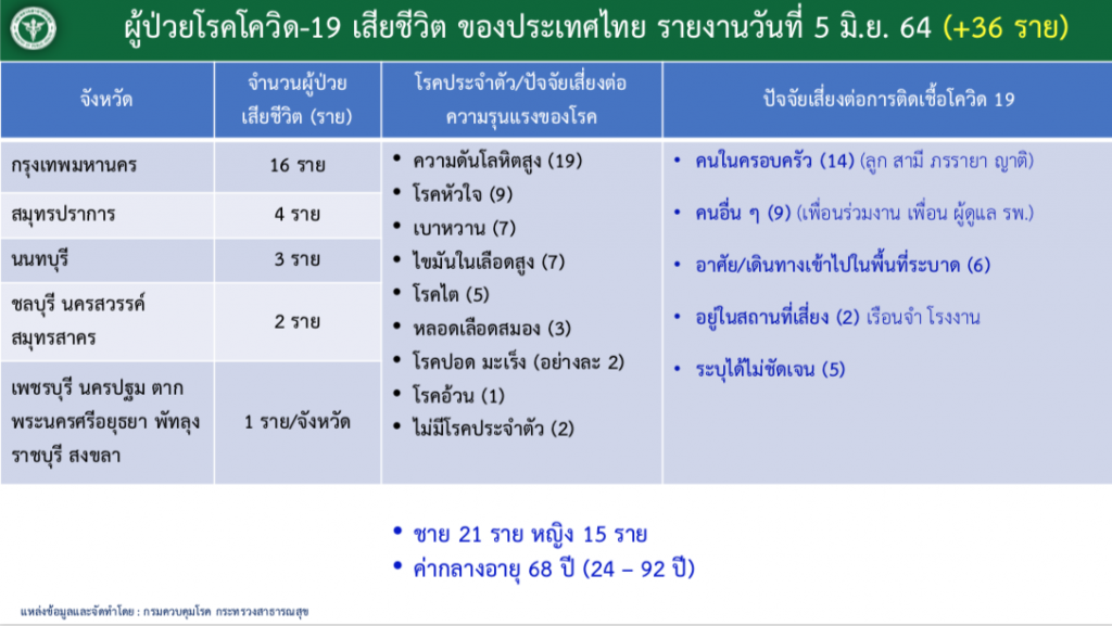 สำหรับยอดผู้เสียชีวิต พบว่า กรุงเทพมหานครสูงสุด 16 คน สมุทรปราการ 4 คน นนทบุรี 3 ชลบุรี นครสวรรค์ สมุทรสาคร จังหวัดละ 2 คน และเพชรบุรี นครปฐม ตาก สงขลา พระนครศรีอยุธยา พัทลุง ราชบุรี จังหวัดละ 1 คน สำหรับปัจจัยเสี่ยงต่อความรุนแรงของโรค ยังคงเป็นความดันโลหิตสูง หัวใจ เบาหวาน ไขมันในเลือดสูง โรคไต หลอดเลือดสมอง โรคปอด มะเร็ง โรคอ้วน ส่วนปัจจัยเสี่ยงของการติดเชื้อ คือ ติดจากคนในครอบครัว ไปในสถานที่เสี่ยง และพบว่าผู้เสียชีวิต เป็นชายมากกว่าหญิง ชาย 21 คน หญิง 15 คน อายุค่ากลางเฉลี่ย จะเป็นผู้สูงอายุ 68 ปี นอนรักษาตัวนานที่สุด คือ 46 วัน ส่วนค่ากลางการรักษา คือ 16 วัน ก่อนเสียชีวิต