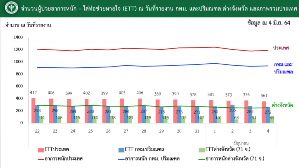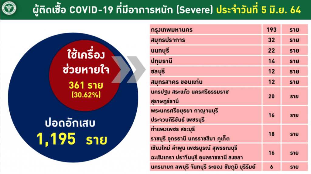 กรุงเทพฯ 5 มิ.ย.-ศบค.ห่วงยอดผู้ป่วยอาการหนักวันนี้ 1,195 คน ใส่เครื่องช่วยหายใจถึง 361 คน กทม. สูงสุด ขณะที่พบคลัสเตอร์ใหม่ ย่านการค้า เขตปทุมวัน ติดเชื้อแล้ว 144 คน