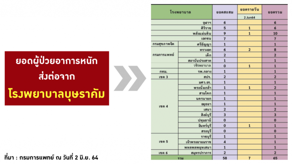 นพ.ทวีศิลป์ กล่าวว่าวันนี้ ที่ประชุม ศปก.ศบค.ได้โฟกัสที่ยอดผู้ป่วยอาการหนักวันนี้ 1,195 คน และคิดเป็นร้อยละ 30 คือ ใส่เครื่องช่วยหายใจ 361 คน พบว่า กรุงเทพฯ ยอดนำสูงสุดในรอบ 24 ชั่วโมง ใส่ท่อช่วยหายใจถึง 193 คน รองลงมา คือ สมุทรปราการ 32 คน นนทบุรี 22 คน ปทุมธานี 14 คน ชลบุรี 12 คน สะท้อนว่าหากยอดผู้ติดเชื้อมีจำนวนมาก จะส่งผลให้จำนวนผู้ป่วยหนักมากตามไปด้วย และทำให้ภาระงานด้านสาธารณสุขจังหวัดนั้นๆ มากตามไปด้วยเช่นกัน จนต้องมีโรงพยาบาลต่างๆ ที่ต้องมาคอยช่วย ซึ่งเป็นเหตุผลให้ตั้งโรงพยาบาลบุษราคัม เพื่อนำบุคลากรทางการแพทย์ที่อยู่ต่างจังหวัดมาช่วยคนกรุงเทพฯ และปริมณฑล รอบละ 14 วัน