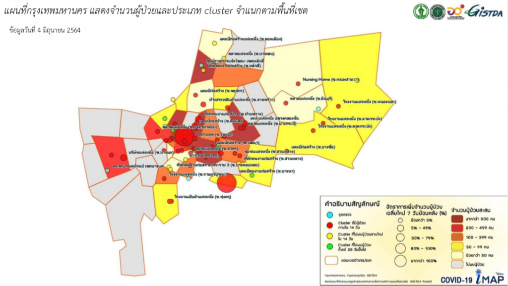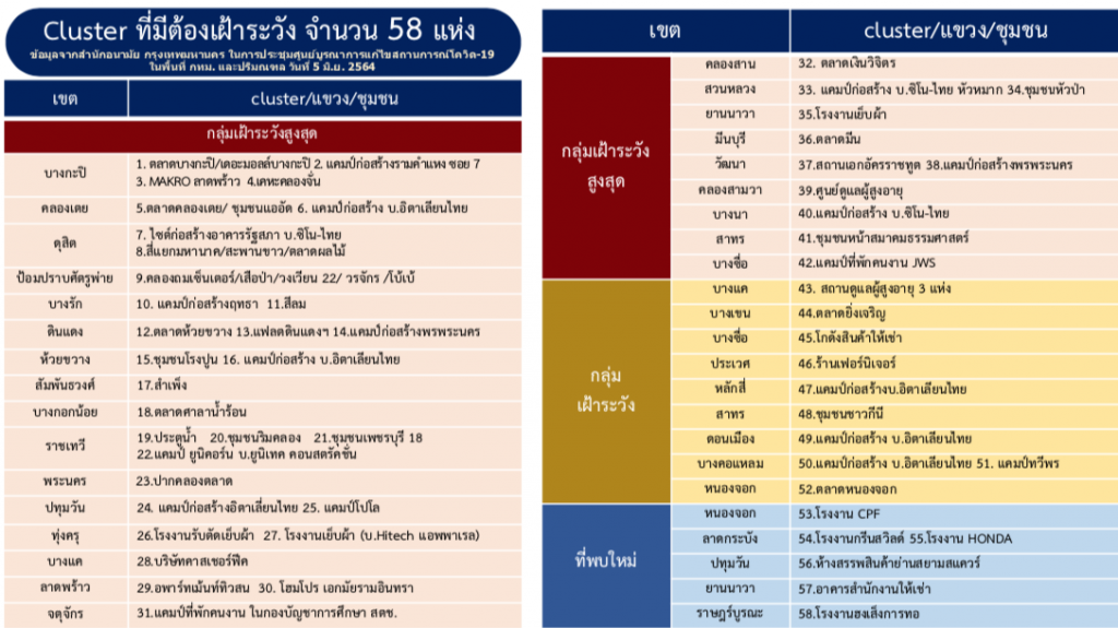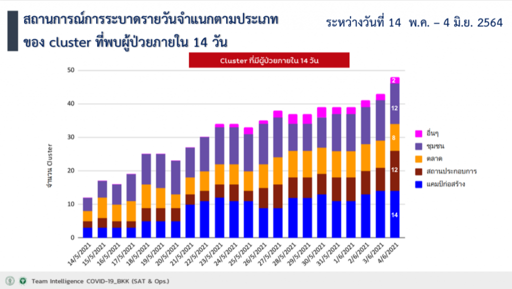 สำหรับคลัสเตอร์ใหม่ในกรุงเทพฯ ที่พบวันนี้ คือ เขตหนองจอก ลาดกระบัง ปทุมวัน ยานนาวา ราษฎร์บูรณะ และยังพบว่ามีผู้ติดเชื้อเป็นกลุ่มก้อนในย่านห้างสรรพสินค้า เขตปทุมวัน ถึง 144 คน ซึ่งกรุงเทพมหานครจะเป็นผู้ให้รายละเอียดต่อไป ทั้งนี้สำนักอนามัยได้วิเคราะห์สาเหตุที่พบคลัสเตอร์ใหม่ขึ้นมาในรอบ 14 วันนี้ทั้งในแคมป์คนงานก่อสร้าง สถานประกอบการ ตลาด ชุมชน เนื่องจากสังคมของคนกรุงเทพฯ ค่อนข้างซับซ้อน สิ่งที่ต้องป้องกัน คือการดูแลสุขอนามัย และจากการสำรวจของตลาด ใน กทม.มีตลาดถึง 486 แห่ง พบว่าผ่านเกณฑ์มาตรฐานด้านสุขอนมัย 97 แห่ง คิดเป็นร้อยละ 35 ส่วนที่เหลือไม่ผ่านต้องมีการพัฒนาและแก้ไขต่อไป