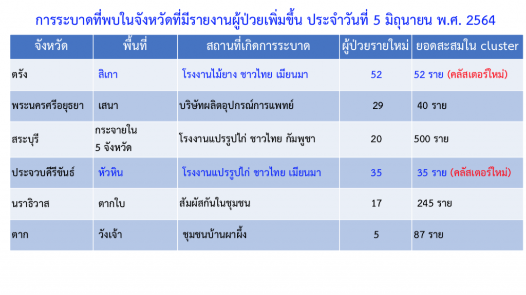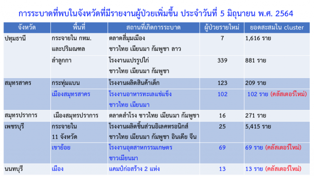 ส่วนคลัสเตอร์ใหม่ที่พบการระบาดของวันนี้ คือ จังหวัดปทุมธานี พบที่ลำลูกกา โรงงานแปรรูปไก่ จังหวัดสมุทรสาคร โรงงานแปรรูปอาหารทะเลแช่แข็ง จังหวัดเพชรบุรี ที่ อ.เขาย้อย โรงงานอุตสาหกรรมเกษตร จังหวัดนนทบุรี คือแคมป์คนงานก่อสร้าง จังหวัดตรัง ที่ อ.สิกา เป็นโรงงานไม้ยาง จังหวัดประจวบคีรีขันธ์ โรงงานแปรรูปไก่