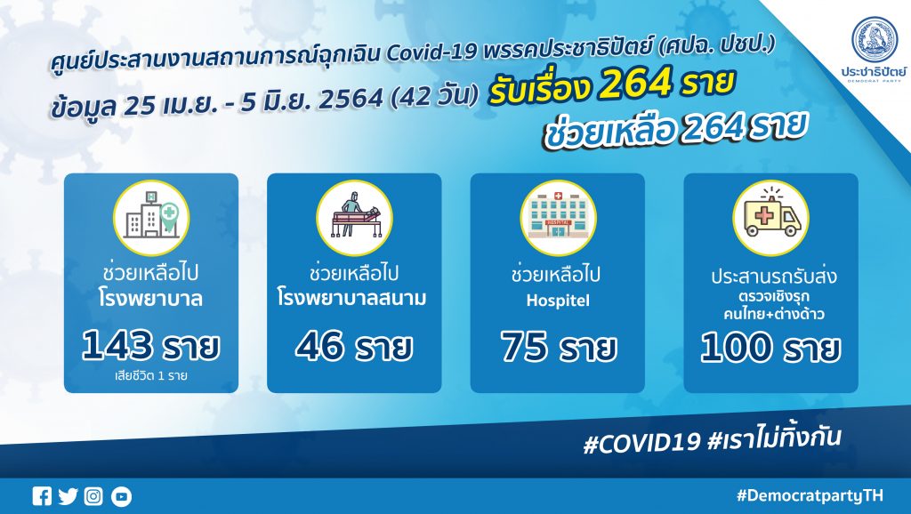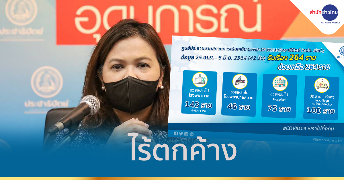 พรรคประชาธิปัตย์ 6 มิ.ย .- ศปฉ.ปชป. สรุปตัวเลขช่วยหาเตียงผู้ป่วยโควิด หลังเปิดศูนย์ฯ เกือบเดือนครึ่ง ไม่มีผู้ป่วยตกค้าง หลายรายกลับบ้านได้ ช่วยทั้งคนไทยและต่างด้าว