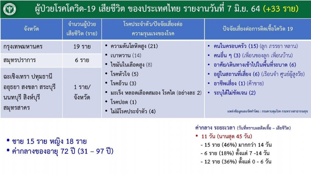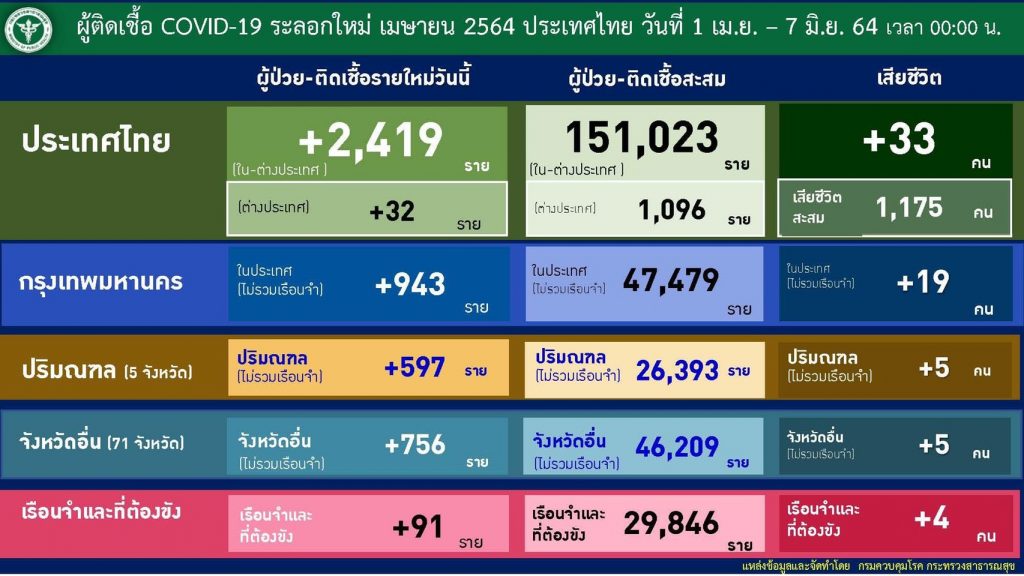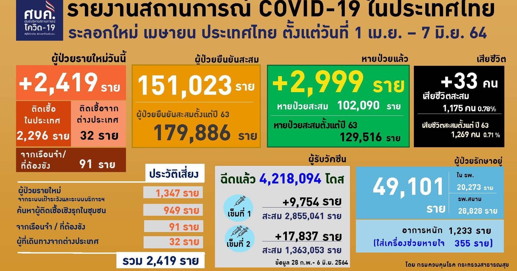 นพ.ทวีศิลป์ วิษณุโยธิน โฆษกศูนย์บริหารสถานการณ์โควิด-19 กล่าวระหว่างแถลงสถานการณ์โควิดประจำวันว่า วันนี้(7 มิ.ย.) มียอดผู้ติดเชื้อรายใหม่รวม 2,419 ราย เป็นผู้ติดเชื้อใหม่ 2,328 ราย ติดเชื้อภายในเรือนจำ/ที่ต้องขัง 91 ราย หายป่วยกลับบ้าน 2,999 ราย รวมผู้ป่วยสะสม 151,023 ราย (ตั้งแต่ 1 เมษายน) และเสียชีวิตเพิ่มอีก 33 ราย ผู้ป่วยรักษาตัวอยู่ในโรงพยาบาล 49,101 ราย อาการหนัก1,233 ราย ต้องใส่เครื่องช่วยหายใจ 355 ราย อย่างไรก็ตาม วานนี้ (6 มิ.ย.) กทม.พบคลัสเตอร์ติดเชื้อโควิด-19 เพิ่มใหม่ 5 แห่ง ใน 4 เขตพื้นที่ ได้แก่ เขตดุสิต เขตราชเทวี เขตลาดพร้าว และเขตวัฒนา โดยยังมีคลัสเตอร์ที่ต้องเฝ้าระวังรวม 63 แห่ง