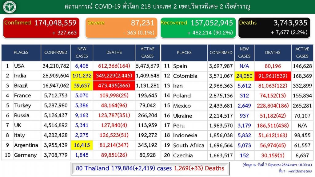 นพ.ทวีศิลป์ กล่าวว่า ส่วนสถานการณ์โรคติดเชื้อไวรัสโคโรนา 2019 (COVID-19) ทั่วโลก ข้อมูล ณ วันจันทร์ที่ 7 มิถุนายน 2564 เวลา 10.00 น. มียอดผู้ติดเชื้อรวม 174,048,559 ราย อาการรุนแรง 87,231 ราย รักษาหายแล้ว 157,052,945 ราย และเสียชีวิต 3,743,935 ราย สำหรับอันดับประเทศที่มีผู้ติดเชื้อสูงสุด อันดับ 1. สหรัฐอเมริกา จำนวน 34,210,782 ราย 2. อินเดีย จำนวน 28,909,604 ราย 3. บราซิล จำนวน 16,947,062 ราย 4. ฝรั่งเศส จำนวน 5,712,753 ราย 5. ตุรกี จำนวน 5,287,980 ราย โดยประเทศไทย อยู่ในอันดับที่ 80 จำนวน 179,886 ราย.-สำนักข่าวไทย