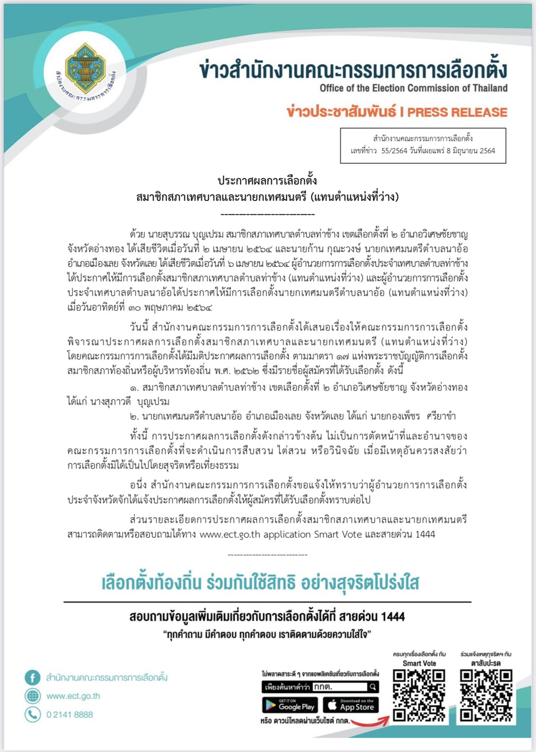 ผู้สื่อข่าวรายงานว่า ที่ประชุมกรรมการการเลือกตั้ง (กกต.) มีมติประกาศผลการเลือกตั้งสมาชิกสภาเทศบาลและนายกเทศมนตรีแทนตำแหน่งที่ว่าง ตามมาตรา 17 พ.ร.บ.การเลือกตั้งสมาชิกสภาท้องถิ่นและผู้บริหารท้องถิ่น ประกอบด้วย นางสุภาวดี บุญเปรม เป็นสมาชิกสภาเทศบาล ต.ท่าช้าง เขตเลือกตั้งที่ 2 อ.วิเศษชัยชาญ จ.อ่างทอง และนางกองเพ็ชร ศรียาขำ เป็นนายกเทศมนตรี ต.นาอ้อ อ.เมืองเลย จ.เลย ซึ่งทั้งสองตำแหน่งเป็นการเลือกตั้งเมื่อวันที่ 30 พฤษภาคม 2564 เนื่องจากนายสุบรรณ บุญเปรม อดีตสมาชิกสภาเทศบาล ต.ท่าช้าง และนายก้าน กุณะวงษ์ อดีตนายกเทศมนตรี ต.นาอ้อ คนเดิมเสียชีวิต