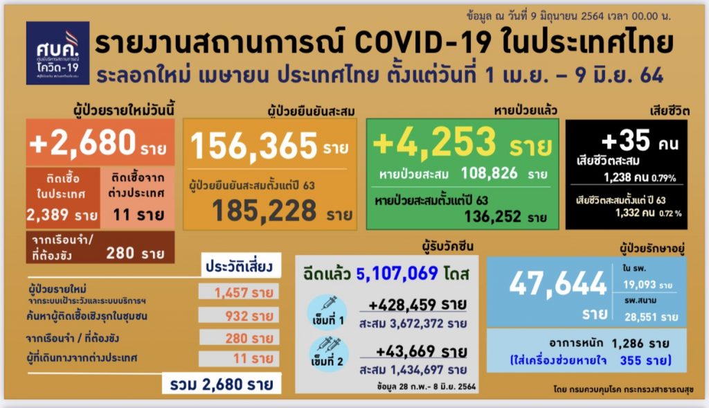สำหรับตัวเลขผู้ติดเชื้อโควิด-19 สะสมของประเทศไทย ประจำวันที่ 9 มิถุนายน 2564 พบจํานวนผู้ติดเชื้อโควิด-19 รายใหม่เพิ่มขึ้น 2,680 ราย แบ่งออกเป็นติดเชื้อใหม่ 2,400 ราย จากเรือนจำ-ที่ต้องขัง 280 ราย ทำให้จำนวนผู้ติดเชื้อสะสม 185,228 ราย มีผู้เสียชีวิตเพิ่ม 35 คน ยอดสะสม 1,332 คน
