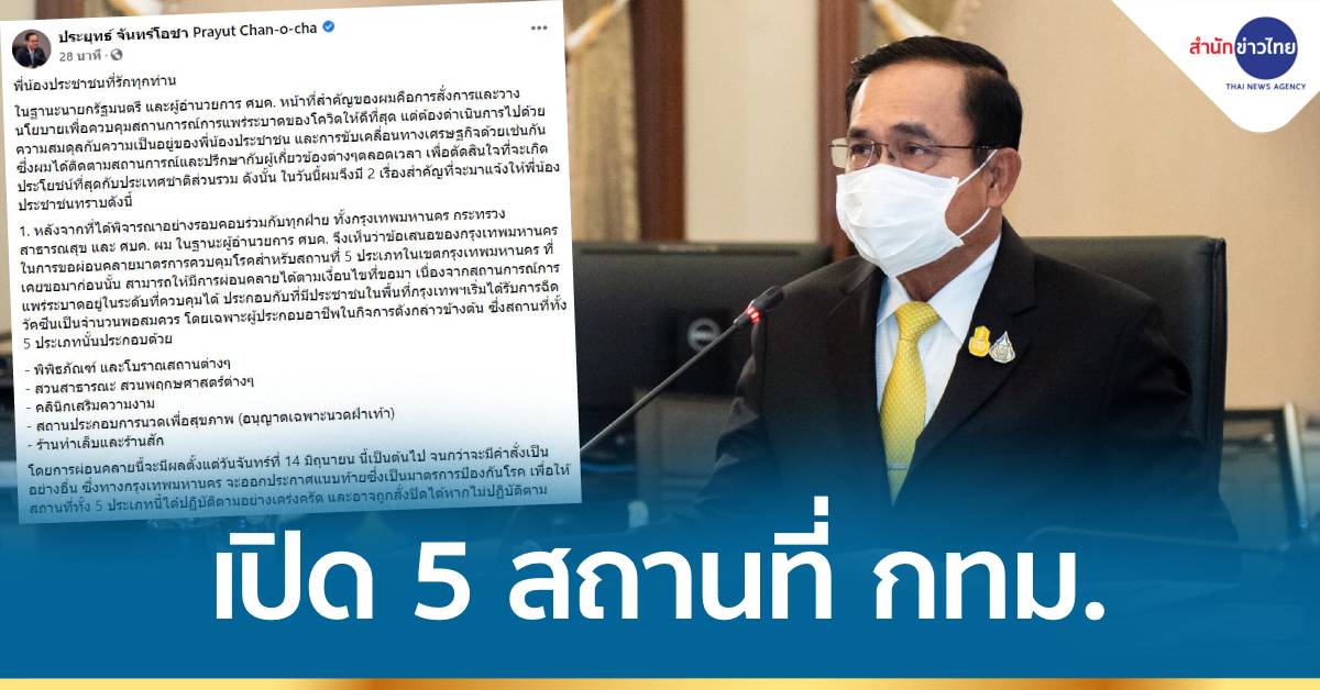 กรุงเทพฯ 12 มิ.ย. – นายกฯ โพสต์เฟซบุ๊ก 14 มิ.ย.นี้ ผ่อนคลายมาตรการสถานที่ 5 ประเภท กรุงเทพมหานคร เปิดได้ปกติ พร้อมเปิดภูเก็ตรับนักท่องเที่ยวแบบไม่ต้องกักตัว 1 ก.ค.นี้