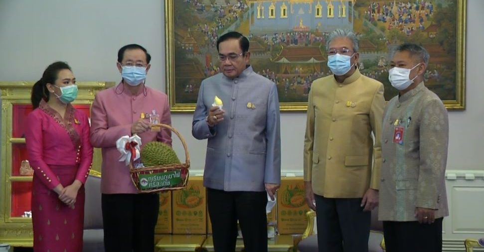เช้าวันนี้ พล.อ.ประยุทธ์ จันทร์โอชา นายกรัฐมนตรีและรัฐมนตรีว่าการกระทรวงกลาโหม เป็นประธานการประชุมคณะรัฐมนตรี ผ่านระบบ Video Conference ณ ห้อง PMOC ชั้น 2 ตึกไทยคู่ฟ้า โดยก่อนการประชุมคณะรัฐมนตรี นายอาคม เติมพิทยาไพสิฐ รัฐมนตรีว่าการกระทรวงการคลังและคณะ เข้าพบนายกรัฐมนตรีเพื่อประชาสัมพันธ์ส่งเสริมการขายทุเรียนภูเขาไฟผ่านเว็บไซต์ www.lavadurian.com ช่องทางออนไลน์ในการสั่งซื้อทุเรียนภูเขาไฟจากชาวสวนโดยตรง นายกรัฐมนตรี ได้ชิมทุเรียนภูเขาไฟศรีสะเกษ ด้วยสีหน้ายิ้มแย้มแจ่มใส และเอ่ยปากชมว่ารสชาติดี หวานมัน พลูสวย ส่วนตัวชื่นชอบทุเรียนภูเขาไฟศรีสะเกษอยู่แล้ว และได้ยินดีที่จะช่วยส่งเสริมการขายทุเรียนโดย ในช่วงโควิด-19 เกษตรกรต่างได้รับผลกระทบเช่นเดียวกับอาชีพอื่นๆ ดังนั้น การส่งเสริมการขายผ่านระบบออนไลน์ จึงเป็นช่องทางหนึ่งที่จะเข้าถึงผู้บริโภคได้โดยง่าย