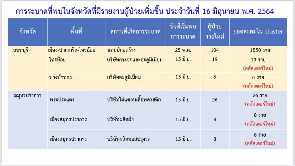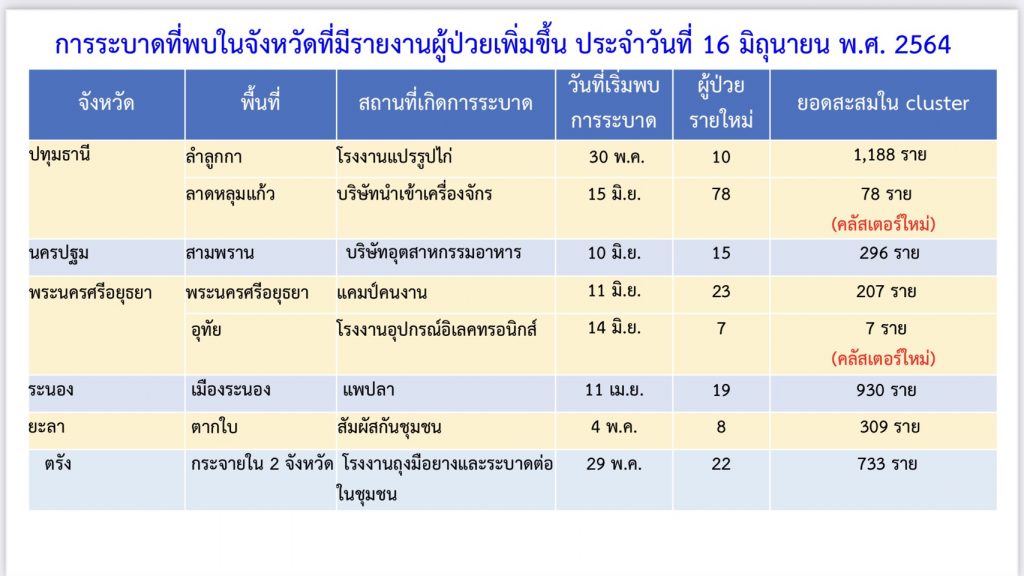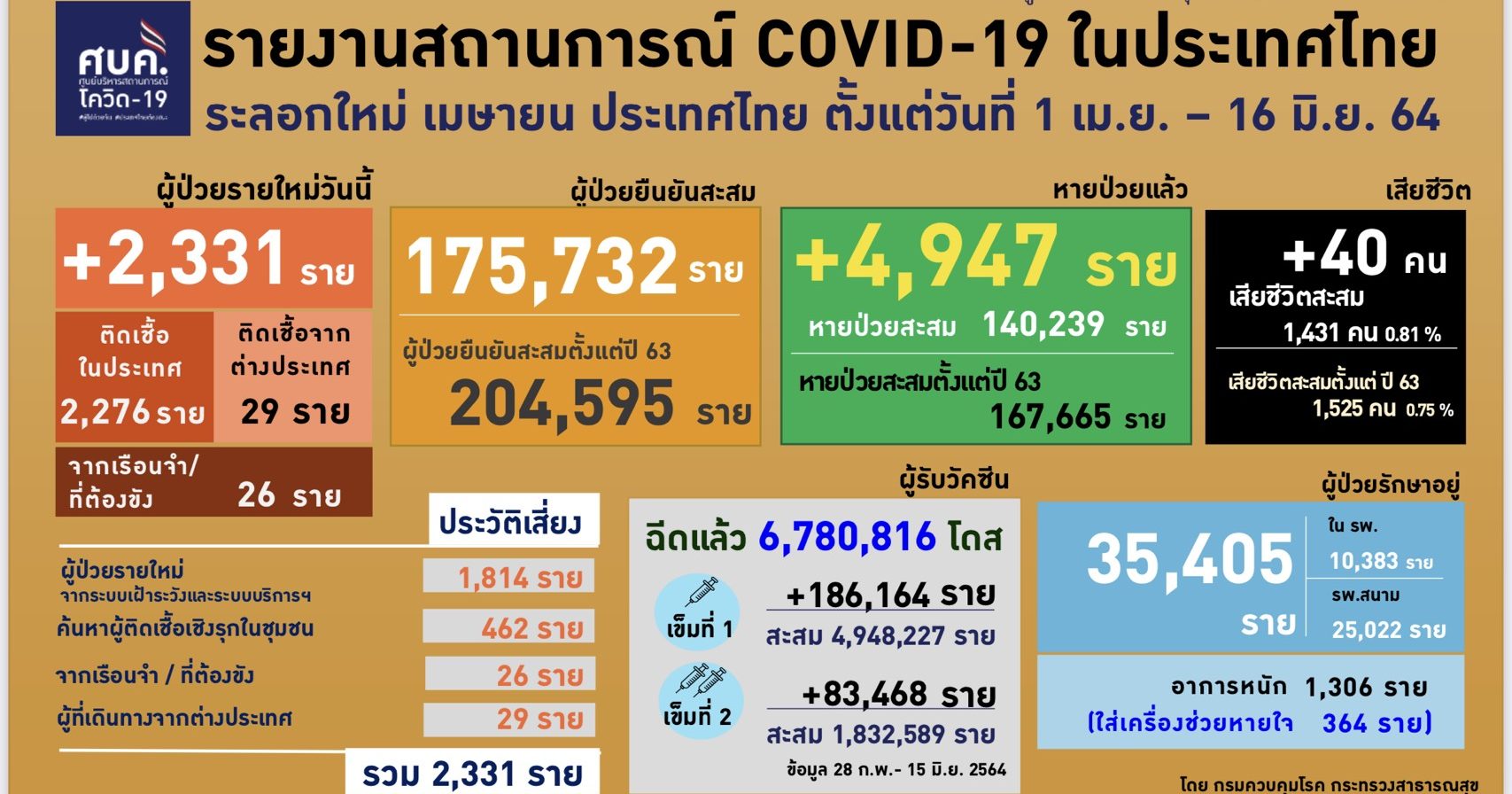 ทำเนียบ 16 มิ.ย.-ศบค.เผยผู้ติดเชื้อรายใหม่ 2,331 ราย เสียชีวิต 40 คน กทม. และปริมณฑลยังน่าห่วง หลังพบคลัสเตอร์ใหม่ต่อเนื่อง ดึงโรงงานเข้าสู่ระบบให้ได้ 100%