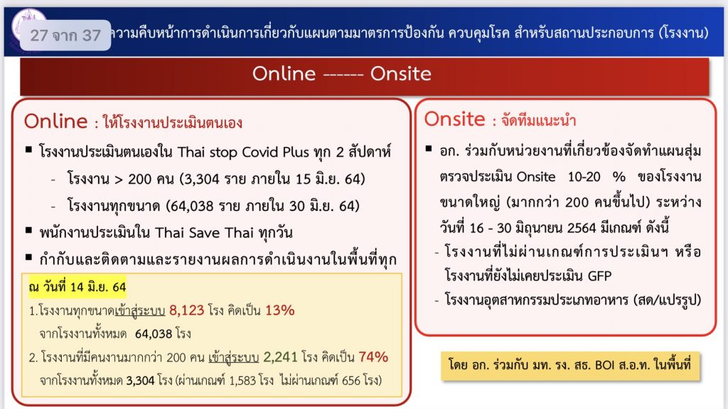 พญ.อภิสมัย ยังกล่าวถึงกลุ่มผู้ติดเชื้อ ในโรงงาน 27 จังหวัด ซึ่งโรงงานต่างๆ จะต้องเข้าสู่ระบบแผนมาตรการป้องกันควบคุมโรค โดยเบื้องต้นโรงงานทั้งหมด 64,038 โรงงาน เข้าสู่ระบบแล้ว 8,123 โรงงาน ทั้งนี้ต้องขอความร่วมมือโรงงานให้เข้าสู่ระบบให้ครบ 100% ซึ่งจะมี อปท.และผู้ว่าราชการจังหวัด คอยกำชับโรงงานให้เข้มงวด หากพบว่ามีคลัสเตอร์ใหม่ จะต้องมีการประชุมตลอดเวลา ทั้งนี้การระบาดของกลุ่มโรงงานทางกรมควบคุมโรคพบว่ามีการระบาดข้ามโรงงาน ที่การควบคุมโรคเป็นไปได้ยากเช่นเดียวกับกรณีของแคมป์คนงาน .- สำนักข่าวไทย