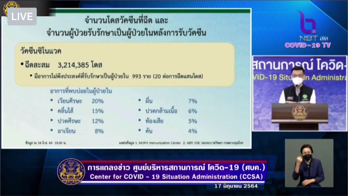 นพ.เฉวตสรร นามวาท ผู้อำนวยการกองควบคุมโรคและภัยสุขภาพในภาวะฉุกเฉิน กรมควบคุมโรค กระทรวงสาธารณสุข ชี้แจงเหตุการณ์ไม่พึงประสงค์หลังฉีดวัคซีนโควิด-19 ว่า ประเทศไทยเริ่มฉีดวัคซีนโควิด-19 ตั้งแต่วันที่ 28 กุมภาพันธ์ 2564 โดยฉีดไปแล้ว 7,003,783 โดส แยกเป็นการฉีดวัคซีนซิโนแวคกว่า 3,214,385 โดส มีอาการไม่พึงประสงค์เข้ารับการรักษาที่โรงพยาบาล จำนวน 993 ราย หากคิดเป็นอัตราคือ 20 ราย ต่อการฉีดวัคซีน 1 แสนโดส พบอาการเวียนศีรษะ ร้อยละ 20 คลื่นไส้ ร้อยละ 15 ปวดศีรษะ ร้อยละ12 อาเจียน ร้อยละ 8 ผื่น ร้อยละ7 ปวดกล้ามเนื้อ ร้อยละ 6 ท้องเสีย ร้อยละ 5 และ คัน ร้อยละ 4