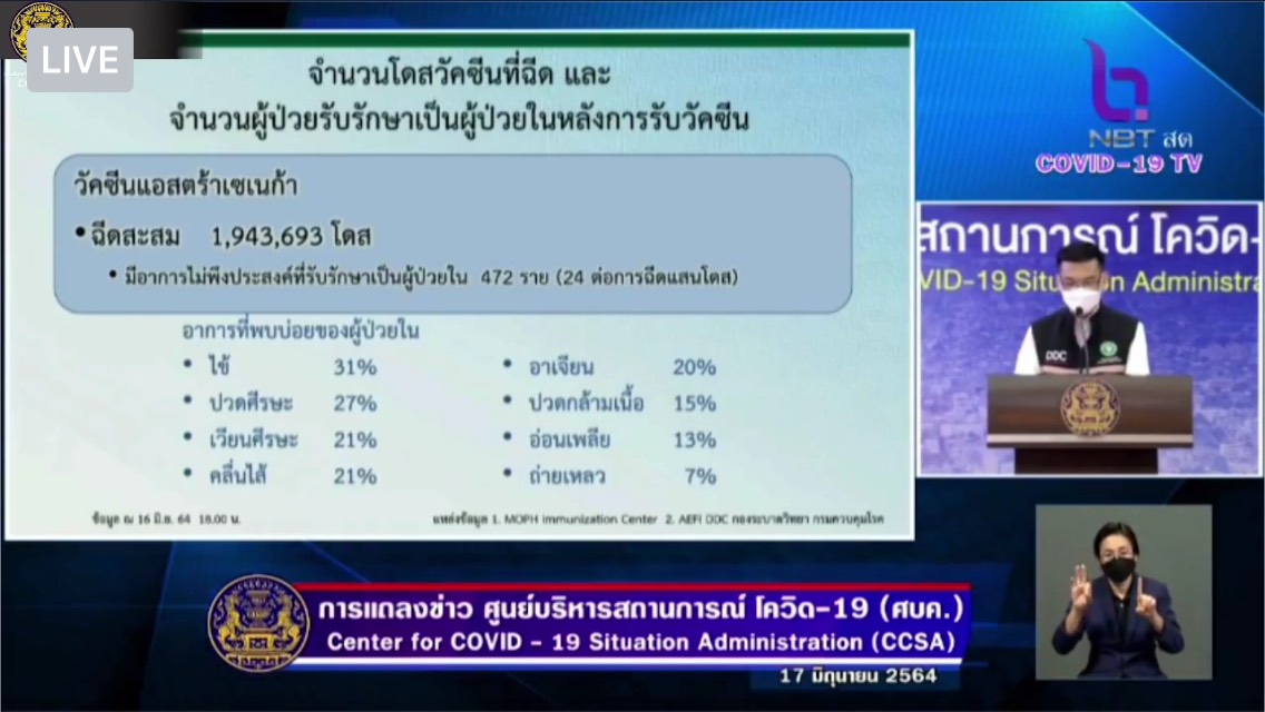 ผู้อำนวยการกองควบคุมโรค กล่าวว่า ส่วนวัคซีนแอสตราเซเนกา ฉีดไปแล้ว 1,943,693 โดส พบมีอาการไม่พึงประสงค์เข้ารับการรักษาในโรงพยายาล 472 ราย คิดเป็นอัตรา 24 รายต่อการฉีด 1 แสนโดส มีอาการไข้มากที่สุด ร้อยละ 31 ปวดศีรษะ ร้อยละ 27 เวียนหัว ร้อยละ 21 คลื่นไส้ ร้อยละ 21 อาเจียน ร้อยละ 20 ปวดกล้ามเนื้อ ร้อยละ 15 อ่อนเพลีย ร้อยละ 15 และถ่ายเหลว ร้อยละ 7