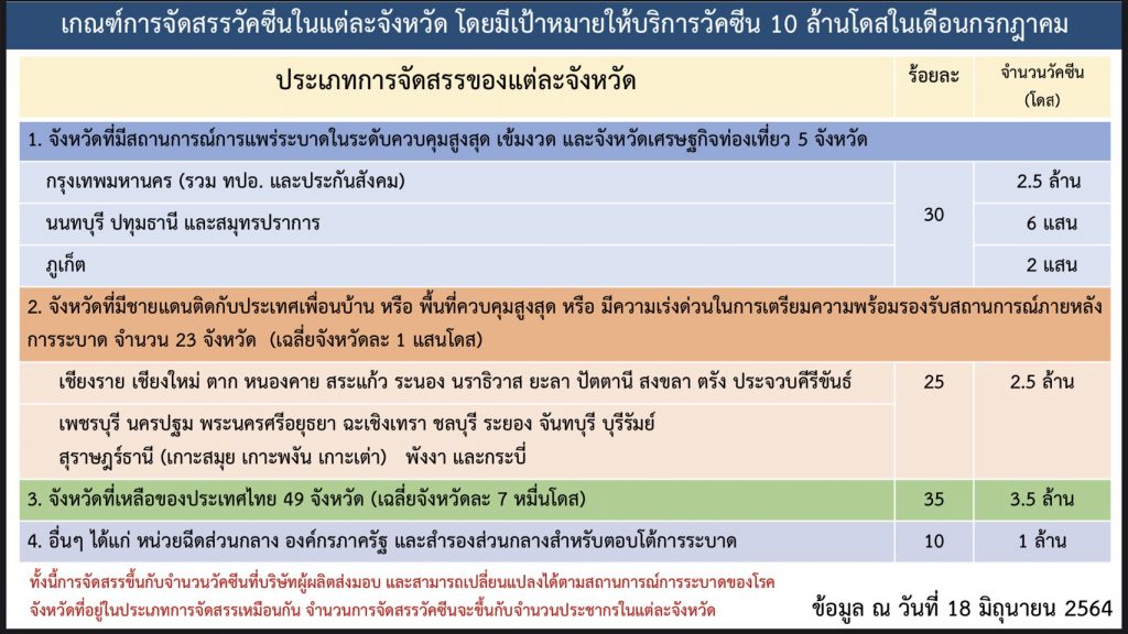 นพ.ทวีศิลป์ กล่าวว่า ได้พิจารณาแบ่งเกณฑ์การจัดสรรวัคซีนทั้ง 10 ล้านโดส เดือน ก.ค.64 ในแต่ละพื้นที่ ได้แก่ 1. พื้นที่สีแดง 5 จังหวัด เป็นจังหวัดที่มีสถานการณ์การแพร่ระบาดของโควิด-19 เช่น พื้นที่ควบคุมสูงสุดและเข้มงวด คือ กรุงเทพฯ สมุทรปราการ นนทบุรี และปทุมธานี รวมถึงจังหวัดที่มีแผนเปิดการท่องเที่ยว ได้แก่ ภูเก็ต ในกลุ่มนี้จะได้รับการจัดสรรวัคซีนที่สัดส่วน 30% แบ่งเป็น กรุงเทพฯ (รวมที่ประชุมอธิการบดี (ทปอ.) และประกันสังคม) ได้รับ 2.5 ล้านโดส ขณะที่นนทบุรี ปทุมธานี สมุทรปราการ ได้รับ 6 แสนโดส และภูเก็ต ได้รับ 2 แสนโดส