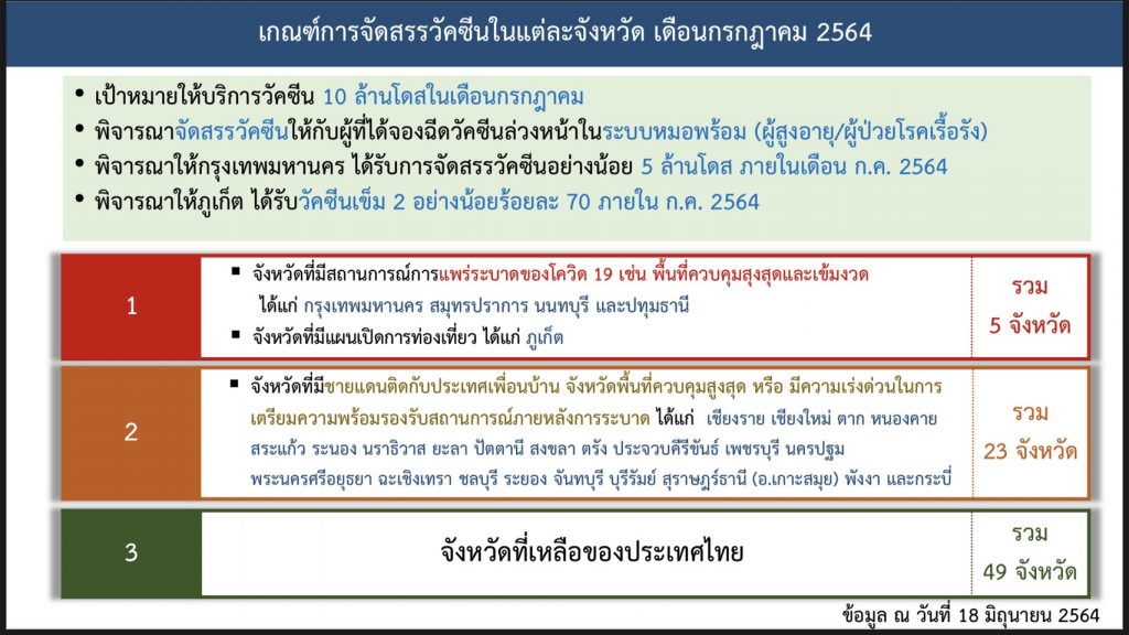 นพ.ทวีศิลป์ วิษณุโยธิน โฆษกศูนย์บริหารสถานการณ์การแพร่ระบาดของโรคติดเชื้อไวรัสโคโรนา 2019 หรือ ศบค. กล่าวว่า ที่ประชุม ศบค.ชุดใหญ่ เห็นชอบหลักเกณฑ์การจัดสรรวัคซีนในแต่ละจังหวัด สำหรับเดือนกรกฎาคม 2564 โดยมีเป้าหมายให้บริการวัคซีน 10 ล้านโดส พร้อมพิจารณาจัดสรรวัคซีนให้กับผู้ที่จองวัคซีนล่วงหน้าในระบบ “หมอพร้อม” ประกอบด้วย ผู้สูงอายุ และผู้ป่วย 7 กลุ่มโรคเรื้อรัง กรุงเทพฯ ต้องได้รับการจัดสรรวัคซีนอย่างน้อย 5 ล้านโดส และ จ.ภูเก็ต ได้รับวัคซีนเข็ม 2 อย่างน้อย 70%