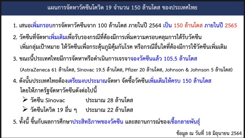 นพ.ทวีศิลป์ ระบุว่า ปัจจุบันประเทศไทยได้มีการจัดหา หรือดำเนินการเจรจาจองวัคซีนแล้ว 105.5 ล้านโดส ประกอบด้วย แอสตราเซเนกา 61 ล้านโดส, ซิโนแวค 19.5 ล้านโดส, ไฟเซอร์ 20 ล้านโดส, จอนห์นสัน แอนด์ จอห์นสัน 5 ล้านโดส ดังนั้น ประเทศไทยต้องเตรียมงบประมาณจัดหาจัดซื้อวัคซีนเพิ่มเติมให้ครบ 150 ล้านโดส โดยให้ภาครัฐจัดหาวัคซีนในส่วนที่เพิ่มขึ้น 50 ล้านโดส คือ วัคซีนซิโนแวค อีกประมาณ 28 ล้านโดส และวัคซีนอื่นๆ อีกประมาณ 22 ล้านโดส ทั้งนี้ ขึ้นกับผลการศึกษาประสิทธิภาพของวัคซีน และสถานการณ์ของเชื้อกลายพันธุ์.-สำนักข่าวไทย