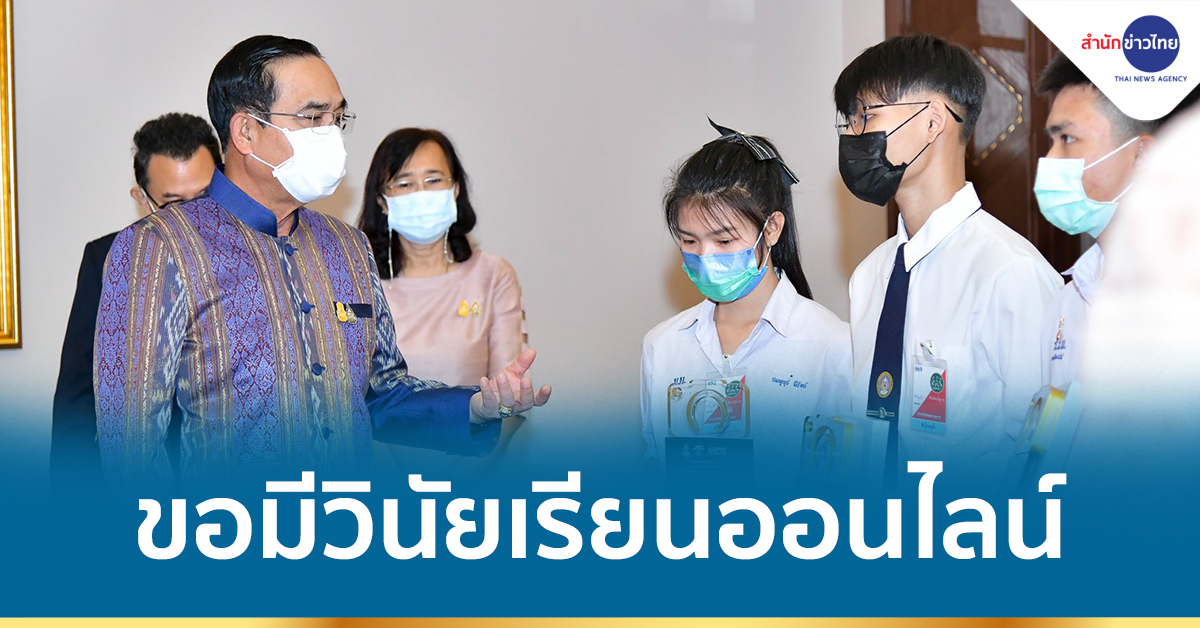 นายกรัฐมนตรี ยังห่วงใยและสอบถามนักเรียน นักศึกษาถึงการเรียนหนังสือออนไลน์ในช่วงนี้ พร้อมกล่าวว่า การเรียนออนไลน์ในช่วงนี้เป็นสถานการณ์ชั่วคราว ขอให้ทุกคนใส่ใจ ที่สำคัญต้องมีวินัยในตนเอง เพราะกระบวนการคิด วิสัยทัศน์ เริ่มจากตัวเราเองแล้วคิดต่อยอดจากหนังสือตำรา รวมทั้งการวางแผนอาชีพในอนาคต นายกรัฐมนตรียังย้ำว่าเยาวชนทุกคนคืออนาคตของชาติที่จะสามารถทำให้ประเทศไทยพัฒนาต่อไปได้.-สำนักข่าวไทย