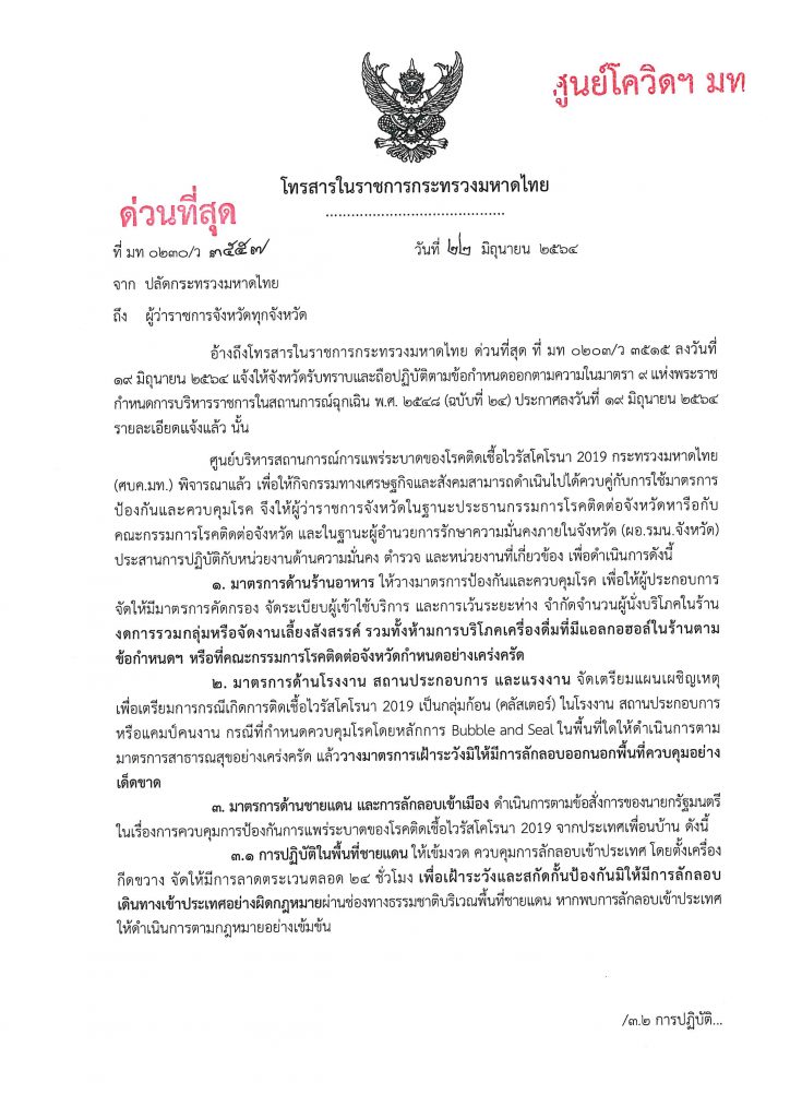 กรุงเทพฯ 23 มิ.ย.-ศบค.มท.ออกคำสั่งกำชับผู้ว่าฯ เข้มงวดห้ามรวมกลุ่มสังสรรค์กินเหล้าในร้านอาหาร และเฝ้าระวังแรงงานต่างด้าวเข้าเมืองผิดกฎหมาย