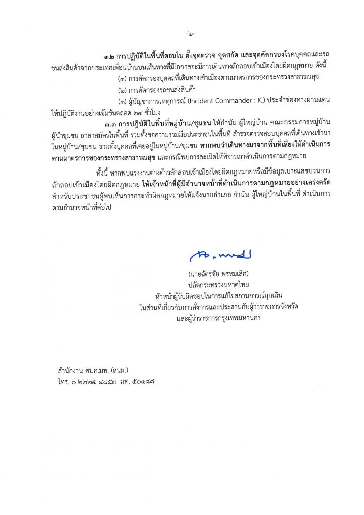 สำหรับการปฏิบัติในพื้นที่ตอนใน ให้ตั้งจุดตรวจ จุดสกัด และจุดคัดกรองโรคบุคคล และรถขนส่งสินค้าจากประเทศเพื่อนบ้านบนเส้นทางที่มีโอกาสจะมีการเดินทางลักลอบเข้าเมืองโดยผิดกฎหมาย ด้วยการคัดกรองบุคคลที่เดินทางเข้าเมืองตามมาตรการของกระทรวงสาธารณสุข คัดกรองรถขนส่งสินค้า และการปฏิบัติในพื้นที่หมู่บ้าน/ชุมชน ให้กำนัน ผู้ใหญ่บ้าน คณะกรรมการหมู่บ้าน ผู้นำชุมชน อาสาสมัครในพื้นที่ รวมทั้งขอความร่วมมือประชาชนในพื้นที่ สำรวจ ตรวจสอบบุคคลที่เดินทางเข้ามาในหมู่บ้านชุมชน และหากพบการละเมิดให้พิจารณาดำเนินการตามกฎหมาย นอกจากนี้ หากพบแรงงานต่างด้าวลักลอบเข้าเมืองโดยผิดกฎหมายหรือมีข้อมูลเบาะแสขบวนการลักลอบเข้าเมืองโดยผิดกฎหมาย ให้เจ้าหน้าที่ผู้มีอำนาจหน้าที่ดำเนินการตามกฎหมายอย่างเคร่งครัด.- สำนักข่าวไทย