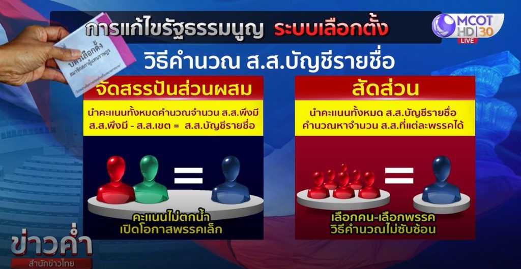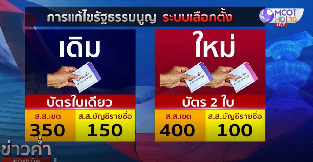 สำหรับหลักการของร่างแก้ไขรัฐธรรมนูญดังกล่าวเป็นการแก้ไขเพิ่มเติมที่กำหนดจำนวน ส.ส. 500 คน มาจากการเลือกตั้งแบบแบ่งเขต 350 คน จากบัญชีรายชื่อของพรรคการเมือง 150 คน ให้มาเป็น ส.ส.เลือกตั้งแบบแบ่งเขต 400 คน ส.ส.แบบบัญชีรายชื่อ 100 คน เพื่อให้สอดคล้องกับประชากรในแต่ละเขต ที่ทำให้ดูแลปัญหาประชาชนได้ทั่วถึง และปรับแก้ใช้บัตรเลือกตั้ง 2 ใบ ให้ประชาชนมีสิทธิในการเลือกพรรคการเมือง และผู้สมัคร เพื่อให้สอดคล้องกับความเป็นจริง โดยกลับไปใช้ระบบคำนวณปาร์ตี้ลิสต์แบบเดิม ใช้บัตรเลือกตั้งแบบบัญชีรายชื่อ แล้วคำนวณคะแนนที่แต่ละพรรคได้รับเลือกตั้งมาคำนวณเพื่อแบ่งเก้าอี้ ส.ส.ปาร์ตี้ลิสต์แทน