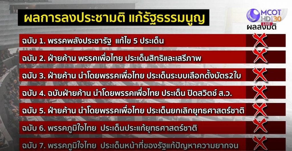 ส่วนฉบับอื่นๆ มีเสียง ส.ว.สนับสนุน ไม่ถึง 84 เสียง ตามเงื่อนไขที่รัฐธรรมนูญกำหนดทำให้ต้องตกไป โดยเฉพาะฉบับปิดสวิตช์อำนาจ ส.ว. มี ส.ว. ร่วมปิดสวิตช์ตัวเองเพียงบางส่วน ส่วนร่างรัฐธรรมนูญฉบับของพรรคพลังประชารัฐ ที่มีปัญหาเสนอแก้กลไกปราบโกงของรัฐธรรมนูญ ส.ว. โหวตคว่ำทั้งหมด