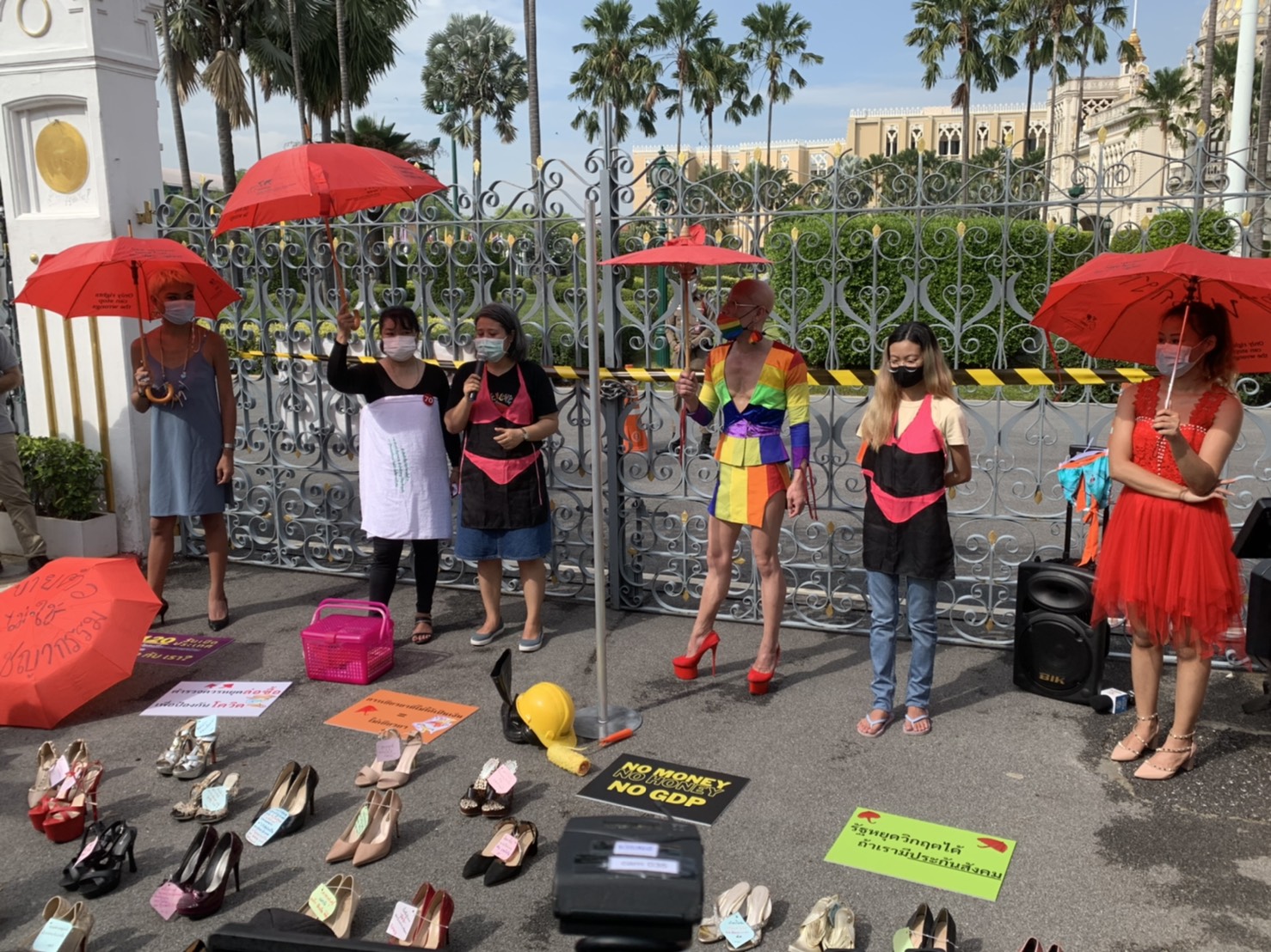 นอกจากนี้ ทางกลุ่มยังได้จัดกิจกรรม “สั่งปิดได้ต้องเยียวยาด้วย ตบส้นสูงพบกันหน้าทำเนียบ” โดยนำรองเท้าส้นสูง พร้อมเขียนข้อความติดไว้มาวางเรียงกัน อาทิ การเยียวยารัฐไม่แก้ปัญหา แต่แก้ผ้าเอาหน้ารอด , สั่งปิดร้านอาหาร สามารถขายเหล้าเบียร์ได้ แต่บาร์ถูกสั่งปิดต่อ คุณเอาส่วนไหนคิด , ภาษีเราก็เสียเหมือนคนอื่น ทำไมไม่เยียวยาเราบ้าง , ควรหยุดล่อซื้อเพื่อป้องกันโควิด รวมถึงมีการนำชุดบิกินีมาโชว์ ถือเป็นสัญลักษณ์ของพนักงานบริการ แต่ไม่ได้ใช้ เนื่องจากถูกสั่งปิดกิจการ.-สำนักข่าวไทย
