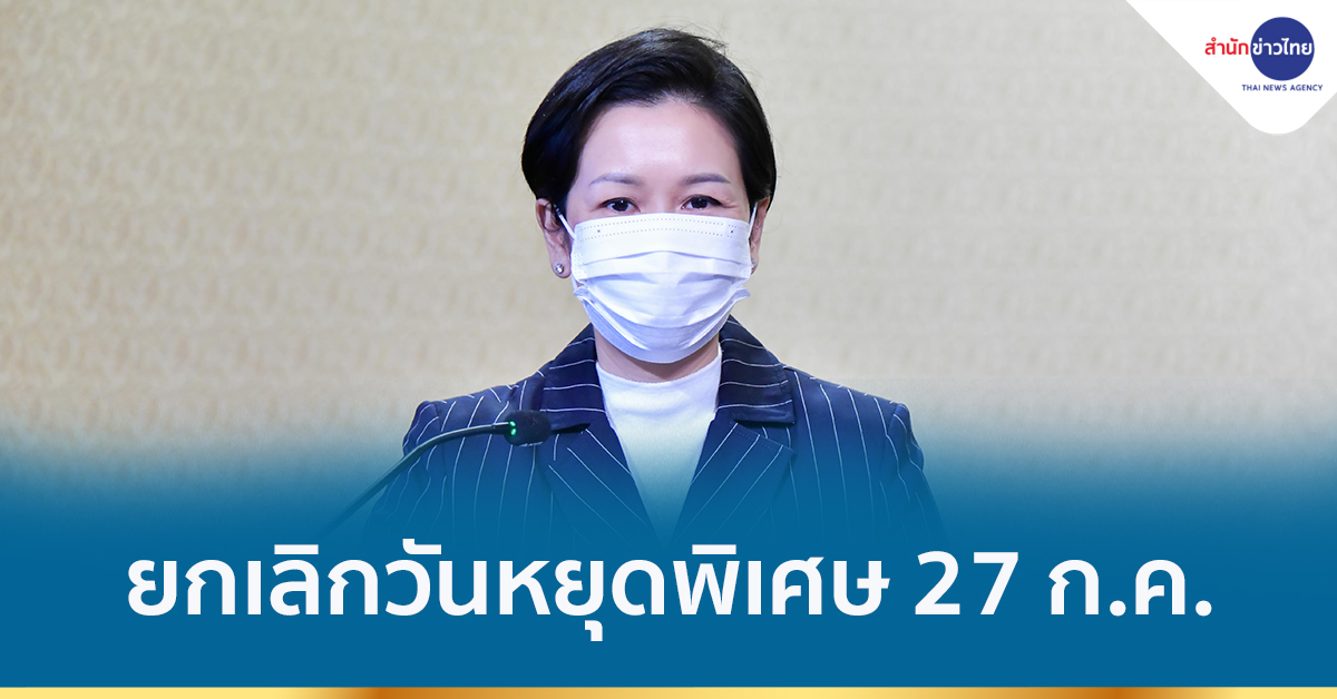 น.ส.รัชดา ธนาดิเรก รองโฆษกประจำสำนักนายกรัฐมนตรี แถลงภายหลังการประชุมคณะรัฐมนตรี ระบุที่ประชุมคณะรัฐมนตรี วันนี้ (29 มิ.ย.) มีมติ “ยกเลิกวันหยุดพิเศษ” ที่เคยกำหนดไว้ในวันอังคารที่ 27 กรกฎาคม 2564 เนื่องจากสถานการณ์โควิด-19 ในปัจจุบันยังมีการระบาดสูง และเพื่อลดการเดินทาง ส่วนประชาชนที่วางแผนการเดินทางไว้แล้ว รัฐบาลได้กำชับส่วนราชการให้อำนวยความสะดวกในการยกเลิกการจองตั๋วเดินทางหรือที่พักของประชาชน .-สำนักข่าวไทย