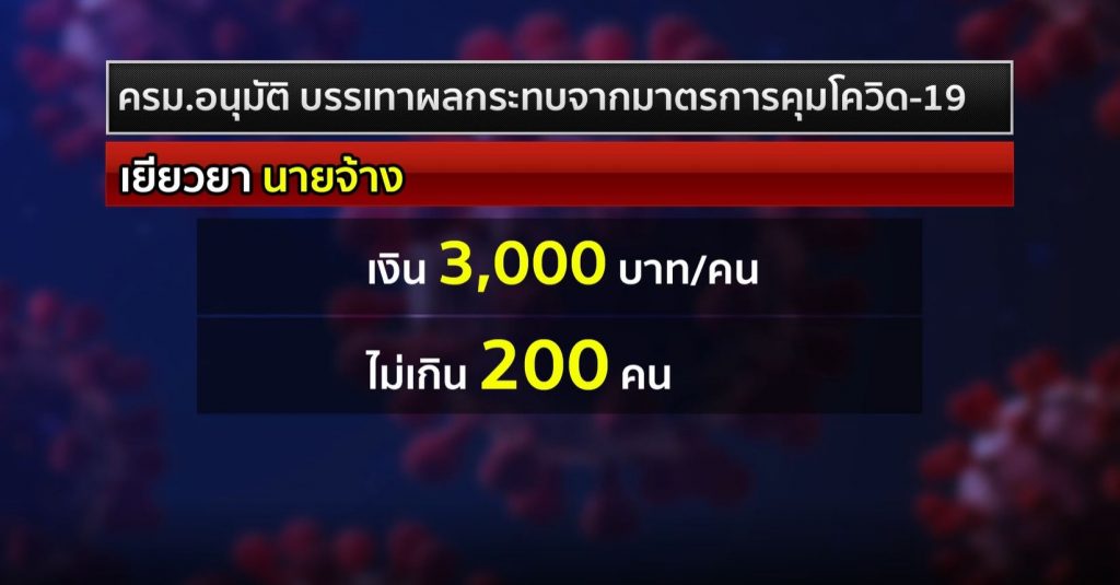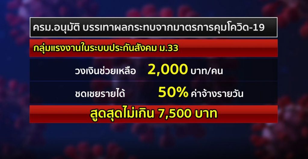 สำหรับรายละเอียดการเยียวยา มาดูกลุ่มแรกกันก่อน คือ กลุ่มที่อยู่ในระบบประกันสังคม อนุมัติเงินเพิ่มเติมให้กับกลุ่มแรงงานที่อยู่ในระบบประกันตนตามมาตรา 33 ที่ถือสัญชาติไทย จะได้รับงินช่วยเหลือเพิ่มเติมในอัตรา 2,000 บาทต่อคน เพิ่มเติมช่วยเหลือจากปกติที่ประกันสังคมจ่ายในอัตราร้อยละ 50 ของเงินค่าจ้าง ตลอดระยะเวลา 1 เดือน สูงสุดไม่เกิน 7,500 บาท สำหรับผู้ประกอบการที่มีลูกจ้างเป็นผู้ประกันตนตามมาตรา 33 จะได้รับการช่วยเหลือตามจำนวนลูกจ้าง จำนวน 3,000 บาทต่อคน สูงสุดไม่เกิน 200 คน