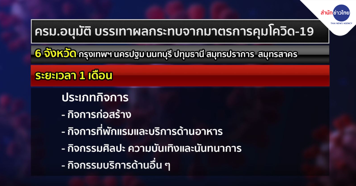กรุงเทพฯ 29 มิ.ย.-ครม. เคาะแล้วมาตรการเยียวยาลูกจ้าง-ผู้ประกอบการ ใน 6 จังหวัดพื้นที่ควบคุมเข้มงวดสูงสุด เป็นเวลา 1 เดือน