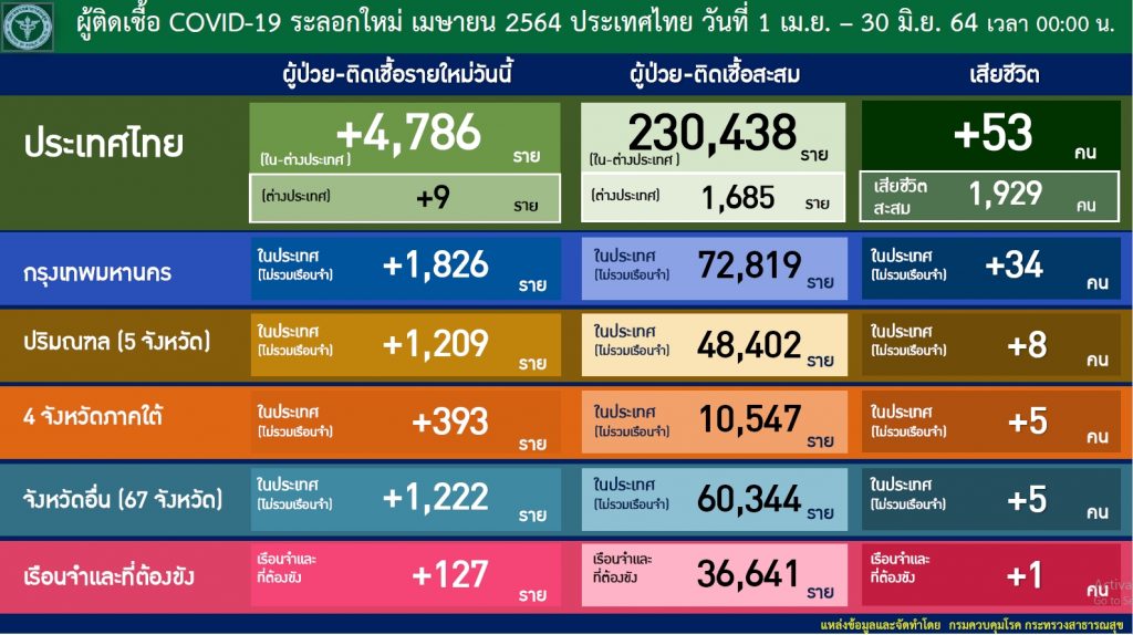 นพ.ทวีศิลป์ วิษณุโยธิน โฆษกศูนย์บริหารสถานการณ์แพร่ระบาดของโรคติดเชื้อไวรัสโคโรนา 2019 (ศบค.)แถลงสถานการณ์โควิด-19ประจำวันว่าวันนี้(30 มิ.ย.)มีผู้ติดเชื้อรายใหม่ 4,786 ราย เป็นผู้ติดเชื้อในประเทศ 4,650 ราย ผู้ติดเชื้อจากต่างประเทศ 9 ราย และจากเรือนจำ/ที่ต้องขัง 127 ราย ทำให้ประเทศไทยอยู่ในลำดับที่ 73 จากทั่วโลก 218 ประเทศ สำหรับผู้ป่วยยืนยันสะสมมีจำนวน 230,438 ราย หายป่วย 2,415 ราย ผู้ป่วยรักษาอยู่ 49,799 ราย แบ่งเป็นรักษาในโรงพยาบาล 22,470 ราย รักษาในโรงพยาบาลสนาม 27,329 ราย อาการหนัก 1,911 ราย ใส่เครื่องช่วยหายใจ 556 ราย และมีผู้เสียชีวิต 53 ราย แบ่งเป็น กทม. 35 คน ปทุมธานี สมุทรปราการ จังหวัดละ 3 คน นครปฐม ยะลา สงขลา จังหวัดละ 2 คน และจันทบุรี นครสวรรค์ ปัตตานี อุตรดิตถ์ อุบลราชธานี ชลบุรี จังหวัดละ 1 คน โดยเป็นชาย 30 คน หญิง 23 คน อายุระหว่าง 24-97 ปี เป็นชาวไทย 49 คน เมียนมา 2 คน จีน 1 คน และอังกฤษ 1 คน ส่วนจำนวนผู้รับวัคซีนในขณะนี้ 9,672,706 โดส แบ่งเป็นเข็มที่ 1 สะสม 6,910,169 ราย เข็มที่ 2 สะสม 2,762,537 ราย