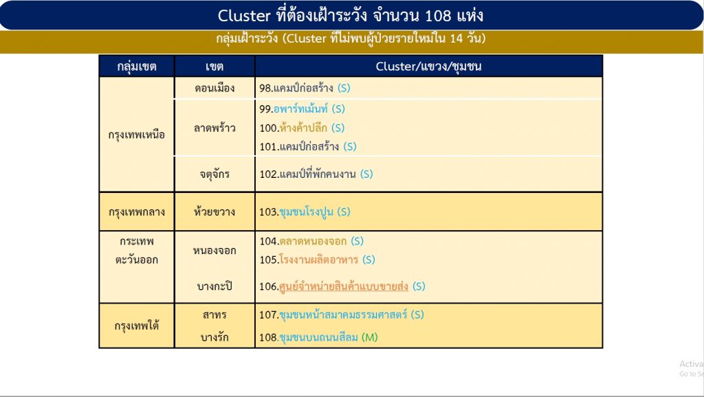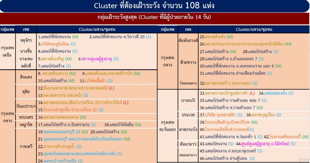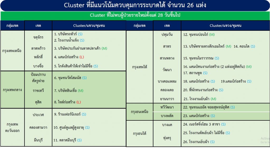 นพ.ทวีศิลป์ กล่าวถึงคลัสเตอร์ที่ต้องเฝ้าระวังในขณะนี้ใน กทม.จำนวน 108 แห่ง โดยมีแนวโน้มสามารถควบคุมการระบาดได้จำนวน 26 แห่ง และวันนี้ กทม. พบคลัสเตอร์ใหม่ 2 แห่ง ประกอบด้วย ชุมชนซอยขุนนาวา เขตบางรัก 25 ราย และแคมป์ที่พักคนงาน พระราม 2 ซอย 50 เขตบางขุนเทียน 94 ราย