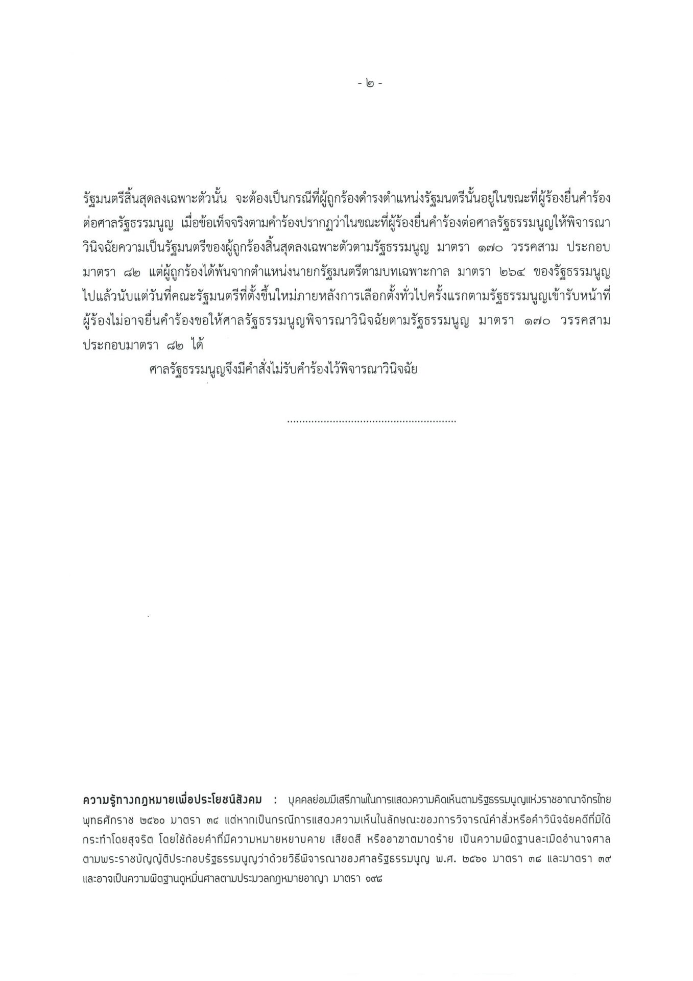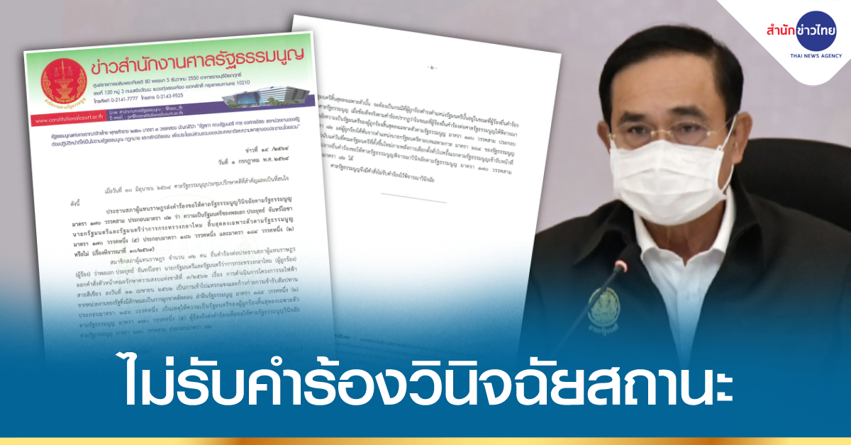 โดยศาลรัฐธรรมนูญเห็นว่า บทบัญญัติของรัฐธรรมนูญเกี่ยวกับความเป็นรัฐมนตรีสิ้นสุดลงเฉพาะตัวตามรัฐธรรมนูญ มาตรา 170 วรรคหนึ่ง (5) ประกอบมาตรา 186 วรรคหนึ่ง และมาตรา 184 วรรคหนึ่ง (2) มีความมุ่งหมายให้ใช้บังคับแก่ผู้ดำรงตำแหน่งรัฐมนตรี ไม่ให้กระทำการอันเป็นการต้องห้ามในขณะที่ดำรงตำแหน่ง หากรัฐมนตรีผู้ใดกระทำการอันเป็นการต้องห้ามดังกล่าวในขณะที่ดำรงตำแหน่งรัฐมนตรีอยู่ ความเป็นรัฐมนตรีของผู้นั้นย่อมสิ้นสุดลง ดังนั้น การยื่นคำร้องตามรัฐธรรมนูญ มาตรา 170 วรรคสาม ประกอบมาตรา 82 เพื่อให้ศาลรัฐธรรมนูญวินิจฉัยให้ความเป็นรัฐมนตรีสิ้นสุดลงเฉพาะตัวนั้น จะต้องเป็นกรณีที่ผู้ถูกร้องดำรงตำแหน่งรัฐมนตรีนั้นอยู่ในขณะที่ผู้ร้องยื่นคำร้องต่อศาลรัฐธรรมนูญ เมื่อข้อเท็จจริงตามคำร้องปรากฏว่า ในขณะที่ผู้ร้องยื่นคำร้องต่อศาลให้พิจารณาวินิจฉัยความเป็นรัฐมนตรีของ พล.อ.ประยุทธ์ สิ้นสุดลงเฉพาะตัวตามรัฐธรรมนูญ มาตรา 170 วรรคสาม ประกอบมาตรา 82 พล.อ.ประยุทธ์ ได้พ้นจากตำแหน่งนายกรัฐมนตรีตามบทเฉพาะกาลมาตรา 264 ของรัฐธรรมนูญไปแล้ว นับแต่วันที่คณะรัฐมนตรีที่ตั้งขึ้นใหม่ภายหลังการเลือกตั้งทั่วไปครั้งแรกตามรัฐธรรมนูญเข้ารับหน้าที่ ผู้ร้องจึงไม่อาจยื่นคำร้องขอให้ศาลรัฐธรรมนูญพิจารณาวินิจฉัยตามรัฐธรรมนูญ มาตรา 170 วรรคสาม ประกอบมาตรา 82 ได้. – สำนักข่าวไทย