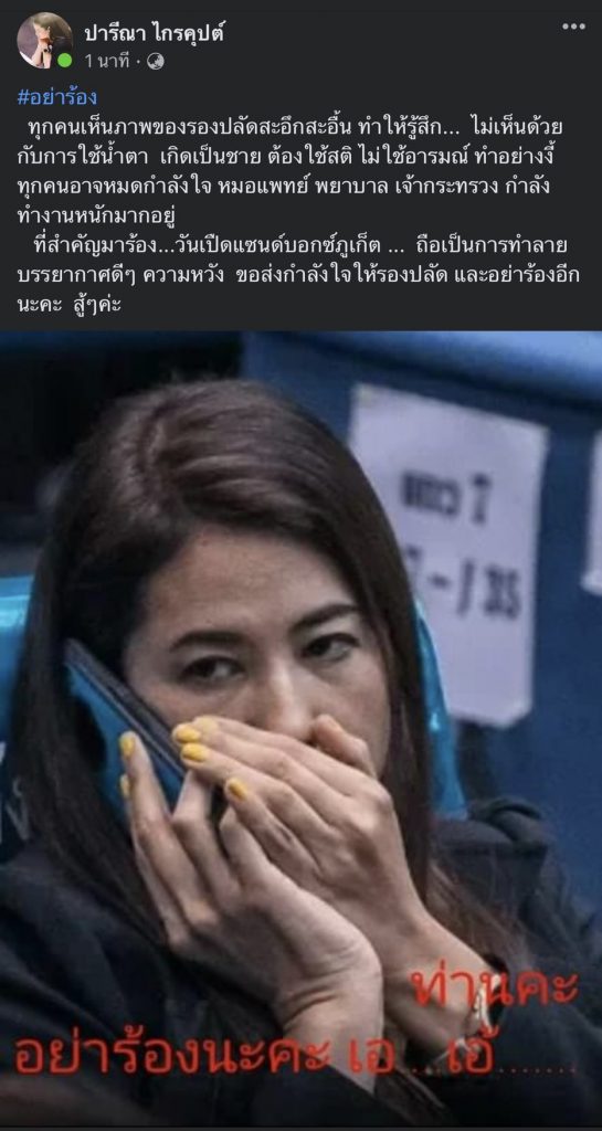 ผู้สื่อข่าวรายงานว่า น.ส.ปารีณา ไกรคุปต์ ส.ส.ราชบุรี พรรคพลังประชารัฐ ได้โพสต์เฟซบุ๊กส่วนตัว ถึงกรณีที่เมื่อวานนี้ (1ก.ค.) นพ.ธงชัย กีรติหัตถยาก รองปลัดกระทรวงสาธารณสุข ที่กล่าวยอมรับด้วยเสียงสั่นเครือว่าโควิดวิกฤตหนักจริง ไม่อยากปล่อยให้ผู้ป่วยนอนเสียชีวิตอยู่ที่บ้าน โดย น.ส.ปารีณา ระบุว่า #อย่าร้อง ทุกคนเห็นภาพของรองปลัดสะอึกสะอื้น ทำให้รู้สึกไม่เห็นด้วยกับการใช้น้ำตา เกิดเป็นชาย ต้องใช้สติ ไม่ใช้อารมณ์ ทำอย่างงี้ทุกคนอาจหมดกำลังใจ หมอแพทย์ พยาบาล เจ้ากระทรวง กำลังทำงานหนักมากอยู่
