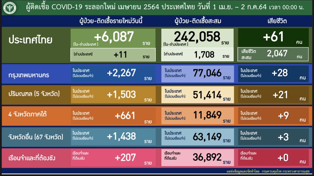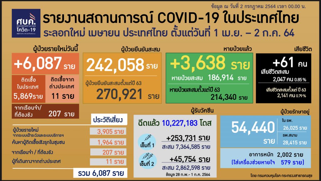 พญ.อภิสมัย ศรีรังสรรค์ ผู้ช่วยโฆษกศูนย์บริหารสถานการณ์การแพร่ระบาดของโรคติดเชื้อไวรัสโคโรนา 2019 (ศบค.) รายงานสถานการณ์ผู้ป่วยติดเชื้อโควิด-19 ในประเทศไทย ซึ่งล่าสุดพบผู้ติดเชื้อรายใหม่อีก 6,087 ราย โดยเป็นการติดเชื้อในประเทศ 6,076 ราย แยกเป็นจากระบบเฝ้าระวังและบริการสุขภาพ 3,905 ราย จากการตรวจคัดกรองเชิงรุกในชุมชน 1,964 ราย จากเรือนจำ/ที่ต้องขัง 207 ราย และเดินทางมาจากต่างประเทศอีก 11 ราย รวมยอดผู้ป่วยสะสม 270,921 ราย วันนี้มีผู้เสียชีวิตอีก 61 ราย ทำให้ยอดเสียชีวิตขยับไปที่ 2,141 ราย รักษาหายเพิ่มอีก 3,638 ราย รวมยอดรักษาหาย 214,340 ราย ยังรักษาอยู่ 54,440 ราย เป็นการรักษาอยู่ใน รพ. 26,025 ราย รพ.สนาม 28,415 ราย ทั้งนี้ มีผู้ป่วยอาการหนัก 2,002 ราย ในจำนวนผู้ป่วยหนักนี้ต้องใส่เครื่องช่วยหายใจถึง 579 ราย เฉพาะการระบาดในระลอกเดือนเมษายน ตั้งแต่วันที่ 1 เม.ย.-2 ก.ค.64 พบผู้ป่วยรายใหม่ 6,087 ราย โดยมีผู้ป่วยยืนยันสะสม 242,058 ราย รักษาหายเพิ่ม 3,638 ราย รวมรักษาหายแล้ว 186,914 ราย ยังรักษาอยู่ 54,440 ราย เสียชีวิต 61 ราย รวมเสียชีวิตสะสม 2,047 ราย