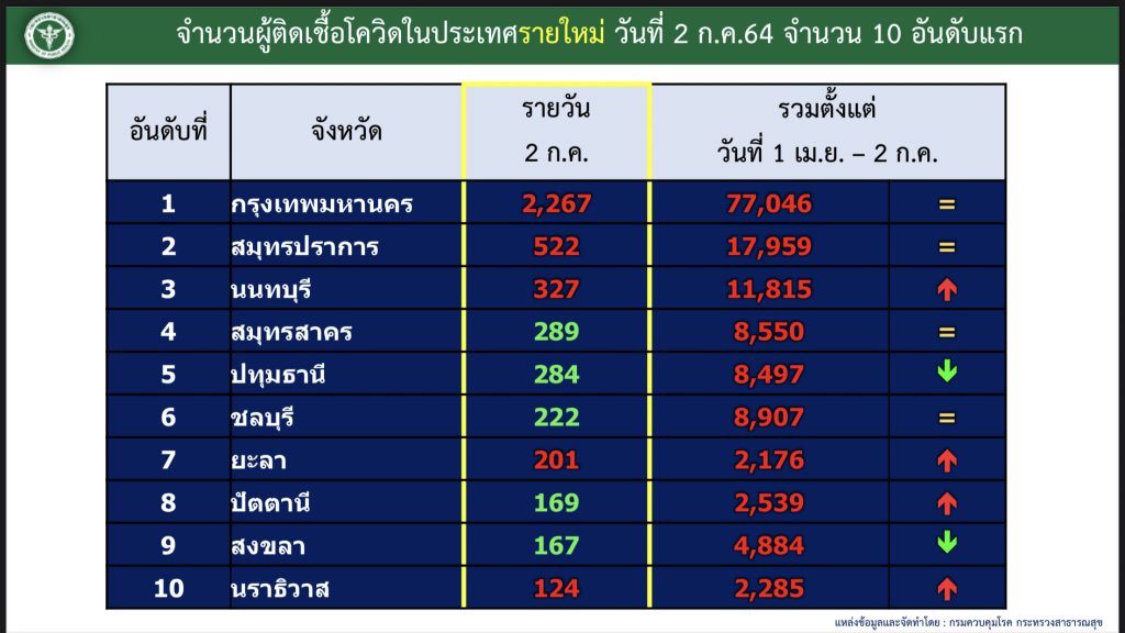ส่วน 10 อันดับจังหวัดที่พบผู้ป่วยภายในประเทศสูงสุด อันดับ 1 ยังเป็นกรุงเทพมหานคร 2,267 ราย อันดับ 2 สมุทรปราการ 522 ราย อันดับ 3 นนทบุรี 327 ราย อันดับ 4 สมุทรสาคร 289 ราย อันดับ 5 ปทุมธานี 284 ราย อันดับ 6 ชลบุรี 222 ราย อันดับ 7 ยะลา 201 ราย อันดับ 8 ปัตตานี 169 ราย อันดับ 9 สงขลา 167 ราย อันดับ 10 นราธิวาส 124 ราย