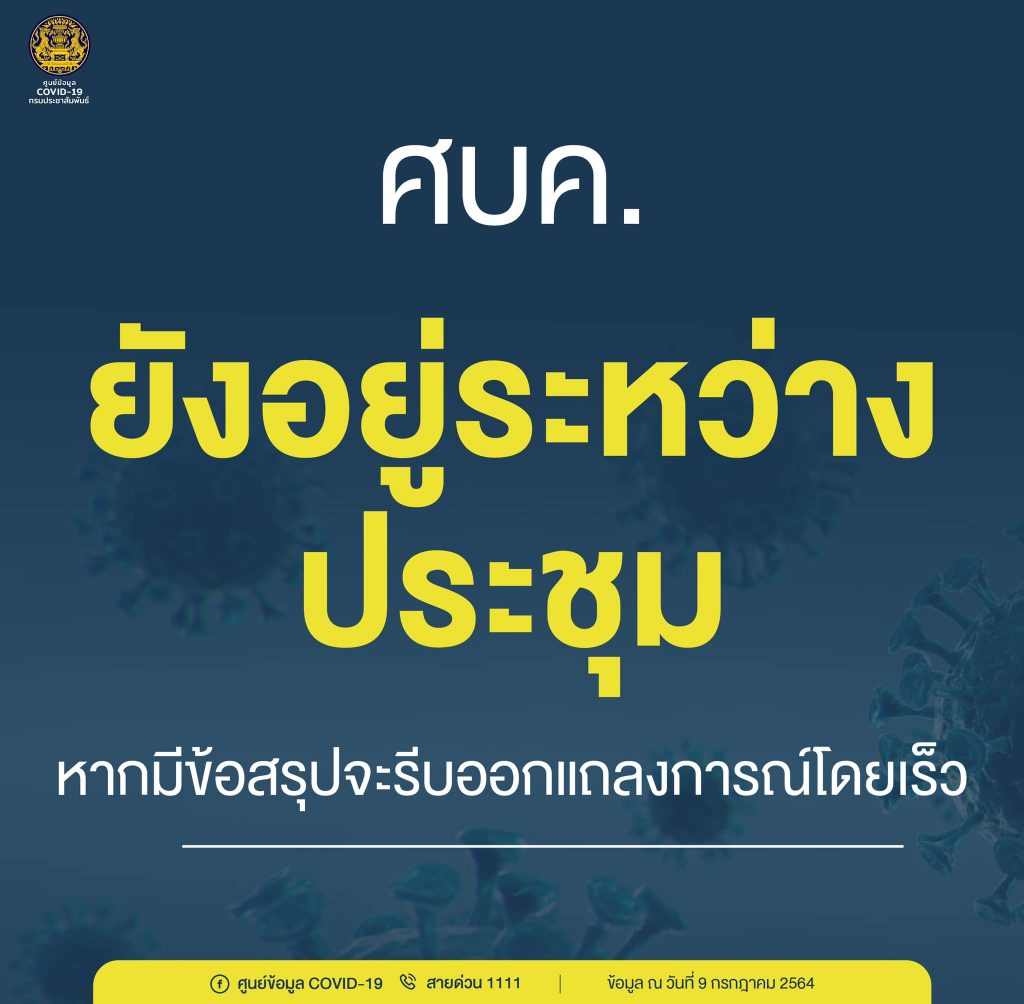 ขณะที่ทีมโฆษกรัฐบาล แจ้งว่าศบค.ยังอยู่ระหว่างประชุม หากมีข้อสรุปจะรีบออกแถลงการณ์โดยเร็ว ทั้งนี้จะแถลงข่าว 16.00 น. วันนี้ ทาง NBT.-สำนักข่าวไทย