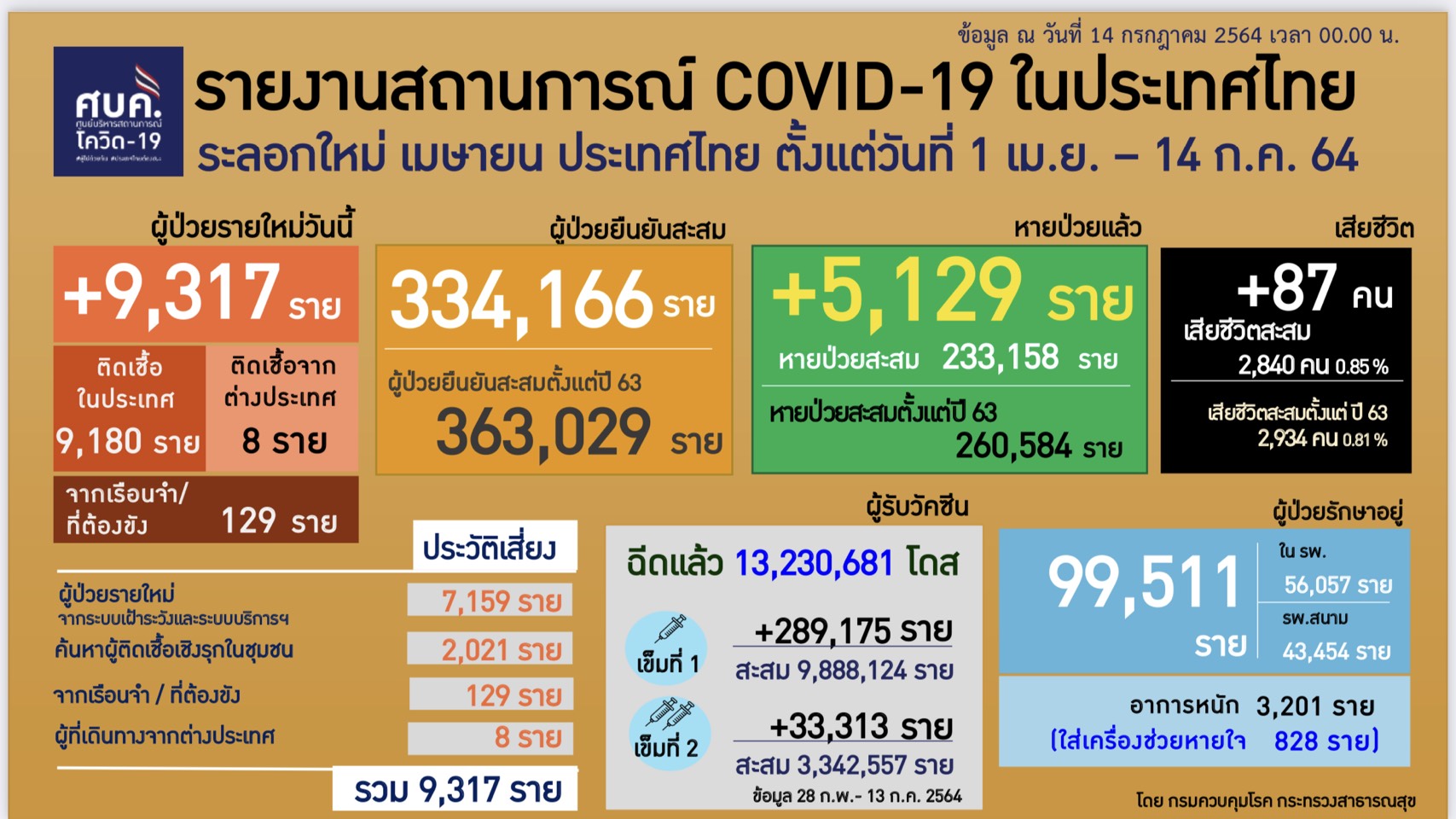 ทำเนียบ 14 ก.ค.-ศบค.รายงานผู้ติดเชื้อใหม่ 9,317 ราย เสียชีวิต 87 คน “อสม.-หญิงตั้งครรภ์” เสียชีวิต ผู้ป่วยอาการหนัก 3,201 ราย หายป่วยเพิ่มอีก 5,129 ราย