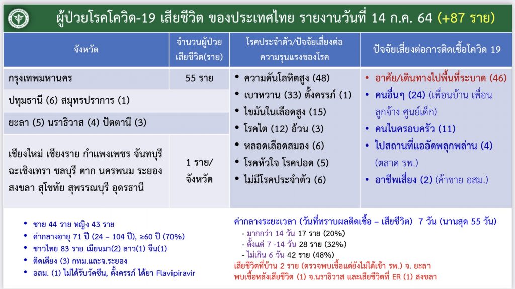 ในจำนวนผู้เสียชีวิตวันนี้ (14 ก.ค.) แบ่งเป็นเพศชาย 44 ราย เพศหญิง 43 ราย ผู้เสียชีวิตที่มีอายุน้อยที่สุด 24 ปี อายุมากที่สุด 104 ปี ค่ากลางของอายุอยู่ที่ 71 ปี สำหรับโรคประจำตัว หรือปัจจัยเสี่ยงต่อความรุนแรงของโรคอันดับต้นๆ ได้แก่ ความดันโลหิตสูง เบาหวาน ตั้งครรภ์ ไขมันในเลือดสูง นอกจากนี้ยังพบว่าในจำนวนผู้เสียชีวิตวันนี้ (14 ก.ค.) มี อสม.ซึ่งเป็นอาชีพเสี่ยง และหญิงตั้งครรภ์ เสียชีวิตด้วย.- สำนักข่าวไทย