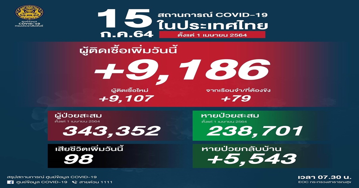 ศูนย์บริหารสถานการณ์การแพร่ระบาดของโรคติดเชื้อไวรัสโคโรนา 2019 (ศบค.) รายงานสถานการณ์การระบาดของวันนี้ (15 ก.ค.) พบผู้ติดเชื้อใหม่ 9,186 ราย แบ่งเป็นผู้ติดเชื้อใหม่ 9,107 ราย จากเรือนจำที่ต้องขัง 79 ราย หายป่วยกลับบ้าน 5,543 ราย หายป่วยสะสม 238,701 ราย ทำให้มียอดผู้ป่วยยืนยันสะสม 343,352 ราย โดยวันนี้(15 ก.ค.) มีผู้เสียชีวิตเพิ่มอีก 98 ราย ขณะที่ภาพรวมของการเสียชีวิตจากสถานการณ์โควิด-19 ตั้งแต่ปี 2563 มีผู้เสียชีวิตไปแล้ว 3,032 ราย.-สำนักข่าวไทย