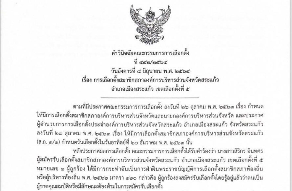 ผู้สื่อข่าวรายงานว่าสำนักงานคณะกรรมการการเลือกตั้ง(กกต.) ได้เผยแพร่ คำวินิจฉัย กกต. เรื่องการเลือกตั้งสมาชิกสภาองค์การบริหารส่วนจังหวัดสระแก้ว อำเภอเมืองสระแก้ว เขตเลือกตั้งที่ 5 โดยระบุว่าหลังประกาศผลเลือกตั้ง กกต.ได้รับคำร้องว่า น.ส.สิริกร อินทศร ผู้สมัครรับเลือกตั้ง ได้มีการกระทำอันเป็นการฝ่าฝืน พ.ร.บ.การเลือกตั้งสภาท้องถิ่นหรือผู้บริหารท้องถิ่น พ.ศ.2562 มาตรา 120 ลงสมัครรับเลือกตั้ง โดยรู้อยู่แล้วว่าเป็นผู้ขาดคุณสมบัติหรือมีลักษณะต้องห้ามในการสมัครรับเลือกตั้ง จากกรณีต้องคำพิพากษาของศาลจังหวัดสระแก้ว ว่ามีความผิดฐานลักทรัพย์โดยใช้ยานพาหนะเพื่อสะดวกแก่การกระทำผิดจำคุก 9 เดือน และปรับ 4,500 บาท โทษจำคุกให้รอลงโทษไว้มีกำหนด 2 ปี จึงเป็นบุคคลผู้มีลักษณะต้องห้ามในการสมัครรับเลือกตั้ง แม้จะไม่ได้ต้องโทษจำคุกจริงก็ตาม แต่ผู้ถูกร้องยังคงเป็นผู้ต้องคำพิพากษาอันถึงที่สุดในคดีดังกล่าว