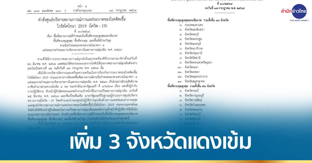 กทม. 18 ก.ค.-ราชกิจจานุเบกษาเผยแพร่ประกาศปรับเพิ่มพื้นที่ควบคุมสูงสุดและเข้มงวดเป็น 13 จังหวัด โดยเพิ่มจังหวัดชลบุรี ฉะเชิงเทรา และพระนครศรีอยุธยา