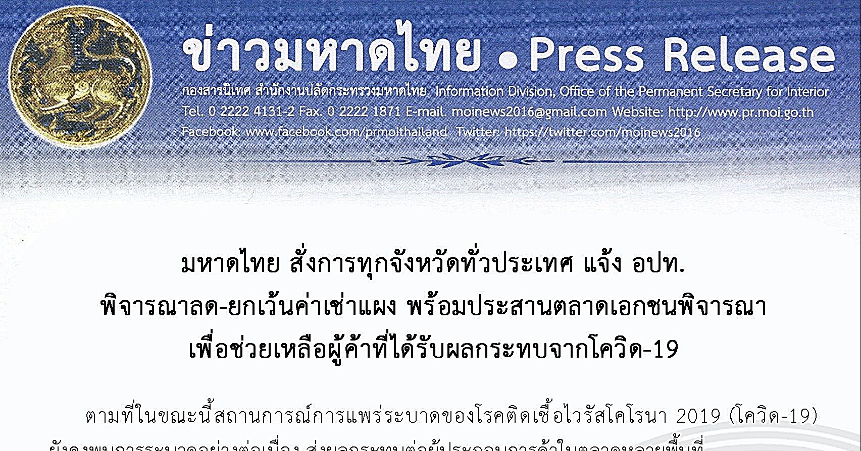 กระทรวงมหาดไทย 19 ก.ค.-มหาดไทยสั่งการทุกจังหวัดแจ้ง อปท.ประสานตลาดเอกชนพิจารณาลด-ยกเว้นค่าเช่าแผง ช่วยผู้ค้าที่ได้รับผลกระทบจากโควิด-19