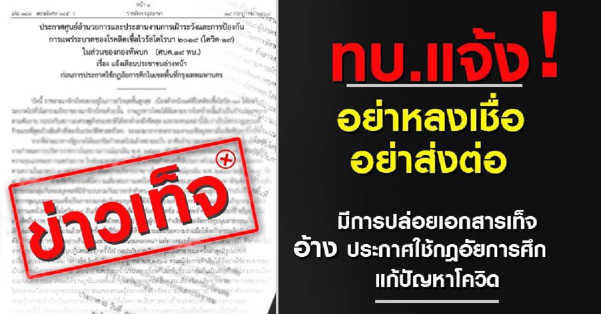 ผู้สื่อข่าวรายงานว่า ทีมโฆษกกองทัพบก ปฏิเสธข่าวการประกาศกฎอัยการศึก โดยมีสาระสำคัญว่า ด้วยในขณะนี้มีการจัดทำเอกสารเท็จและถูกปล่อยออกมาในโซเชียลมีเดีย อ้างว่าเป็นการแจ้งเตือนประชาชนล่วงหน้า ก่อนการประกาศใช้กฎอัยการศึกใน กทม. เพื่อป้องกันอันตรายจากการแพร่ระบาดของCOVID-19 ในราชอาณาจักร ประกาศโดย ศบค19ทบ. นั้น