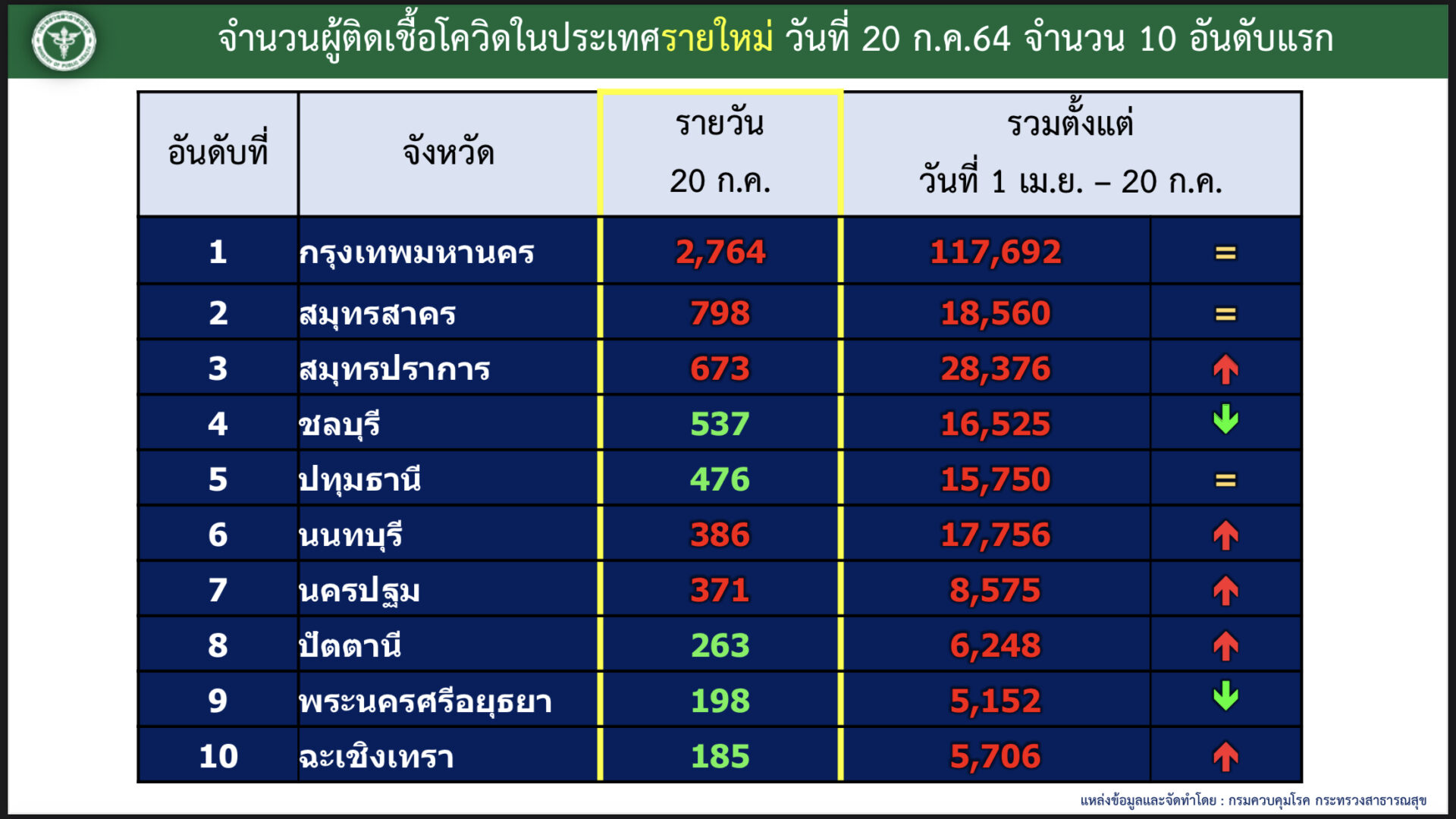 10 อันดับ ผู้ติดเชื้อโควิด-19 ในประเทศ วันที่ 20 ก.ค. 2564 คือ 1. กรุงเทพมหานคร 2,764 ราย 2. สมุทรสาคร 798 ราย 3. สมุทรปราการ 673 ราย 4. ชลบุรี 537 ราย 5. ปทุมธานี 476 ราย 6. นนทุบรี 386 ราย 7. oครปฐม 371 ราย 8. ปัตตานี 263 ราย 9. พระนครศรีอยุธยา 198 ราย 10. ฉะเชิงเทรา 185 ราย พบคลัสเตอร์ใหม่ วันนี้พบ 1 จังหวัด คือ สมุทรปราการ โรงงานผลิตเชือก อ.พระสมุทรเจดีย์ ทั้งนี้ หลายจังหวัดยังคงพบผู้ติดเชื้อเพิ่มเติมในคลัสเตอร์เดิมอย่างต่อเนื่อง