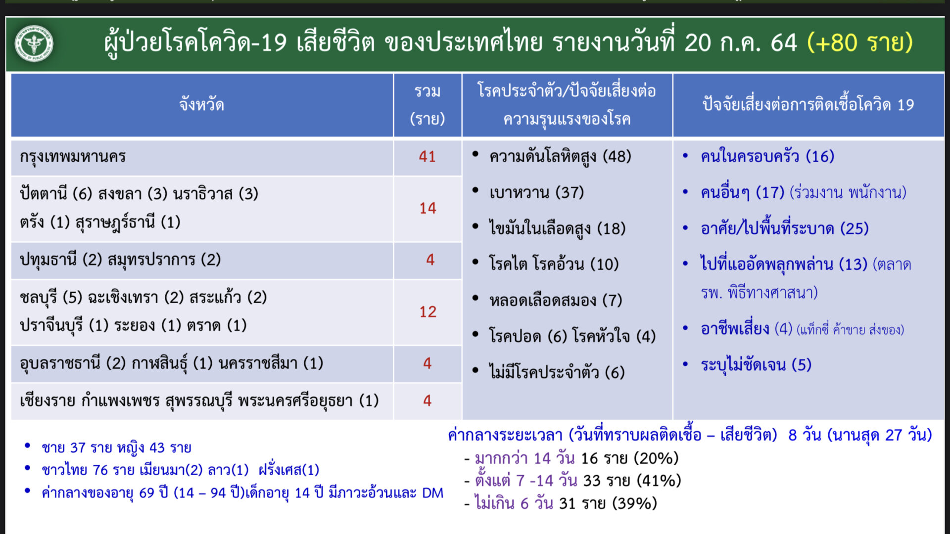 เสียชีวิต 80 ราย รวมเสียชีวิตสะสม 3,408 ราย สำหรับผู้เสียชีวิตทั้ง 80 ราย เป็น ชาย 37 ราย หญิง 43 ราย กทม. 41 ราย ปัตตานี 6 ราย ชลบุรี 5 ราย สงขลา นราธิวาส จังหวัดละ 3 ราย ปทุมธานี สมุทรปราการ ฉะเชิงเทรา สระแก้ว อุบลราชธานี จังหวัดละ 2 ราย สุราษฎร์ธานี ปราจีนบุรี ระยอง ตราด กาฬสินธุ์ นครราชสีมา เชียงราย กำแพงเพชร สุพรรณบุรี พระนครศรีอยุธยา จังหวัดละ 1 ราย โรคประจำตัว ความดันโลหิตสูง เบาหวาน ไขมันในเลือดสูงเป็นปัจจัยเสี่ยง พบ 6 รายที่ไม่มีโรคประจำตัว ซึ่งมีปัจจัยเสี่ยงติดเชื้อจากคนในครอบครัวมากที่สุด อายุค่ากลาง 69 ปี อายุน้อยสุด 14 ปี มีภาวะอ้วนและ DM หรือ โรคเบาหวาน อายุมากสุด 94 ปี
