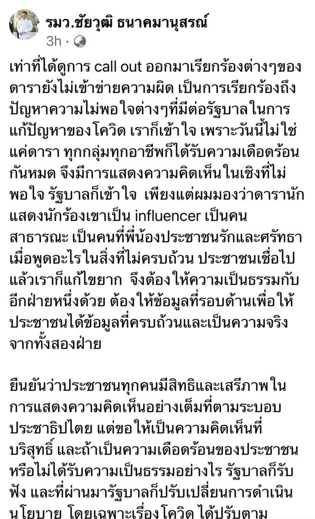 นายชัยวุฒิ ธนาคมานุสรณ์ รัฐมนตรีว่าการกระทรวงดิจิทัลเพื่อเศรษฐกิจและสังคมโพสต์ เฟซบุ๊ก “รมว.ชัยวุฒิ ธนาคมานุสรณ์” ถึงกรณีศิลปินดาราออกมา วิพากษ์วิจารณ์ รัฐบาลถึงการบริหารจัดการสถานการณ์โควิด 19 หรือ call out โดยระบุว่า เท่าที่ได้ดูการ call out ออกมาเรียกร้องต่างๆของดารายังไม่เข้าข่ายความผิด เป็นการเรียกร้องถึงปัญหาความไม่พอใจต่างๆที่มีต่อรัฐบาลในการแก้ปัญหาของโควิด ซึ่งก็เข้าใจ เพราะวันนี้ไม่ใช่แค่ดารา ทุกกลุ่มทุกอาชีพก็ได้รับความเดือดร้อนกันหมด จึงมีการแสดงความคิดเห็นในเชิงที่ไม่พอใจ รัฐบาลก็เข้าใจ เพียงแต่มองว่าดารา นักแสดง นักร้องเขาเป็น influencer เป็นคนสาธารณะ เป็นคนที่พี่น้องประชาชนรักและศรัทธา เมื่อพูดอะไรในสิ่งที่ไม่ครบถ้วน ประชาชนเชื่อไปแล้วเราก็แก้ไขยาก จึงต้องให้ความเป็นธรรมกับอีกฝ่ายหนึ่งด้วย ต้องให้ข้อมูลที่รอบด้านเพื่อให้ประชาชนได้ข้อมูลที่ครบถ้วนและเป็นความจริงจากทั้งสองฝ่าย